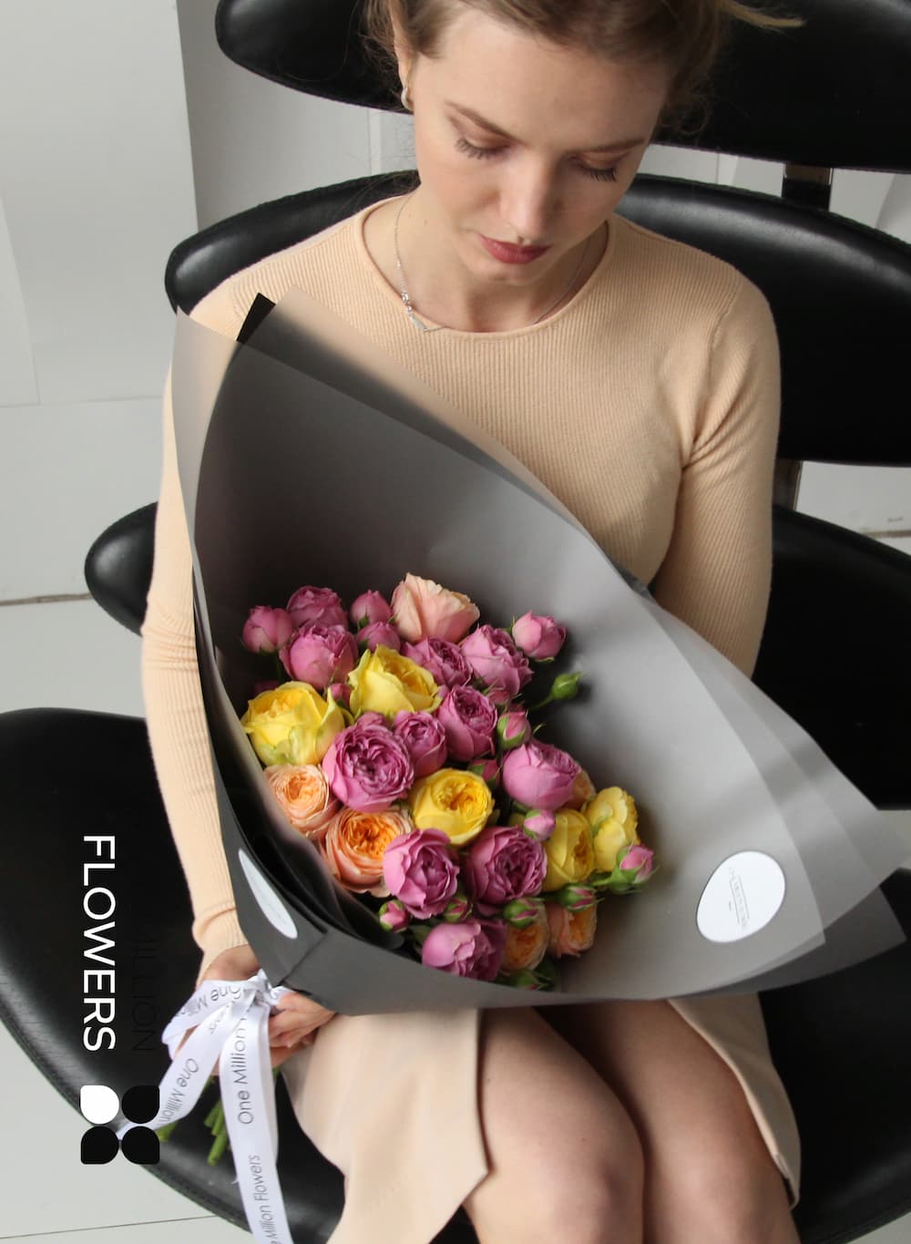 Букет "Джуси Пэш" — это роскошная цветочная композиция, в которой гармонично соединяются нежность и яркость. В его состав входят 15 кустовых роз Мисти Баблз, 11 пионовидных роз Девид Остин Джульетта и 7 эквадорских роз Каталина. Каждый цветок был тщательно отобран для создания уникального и завораживающего букета.