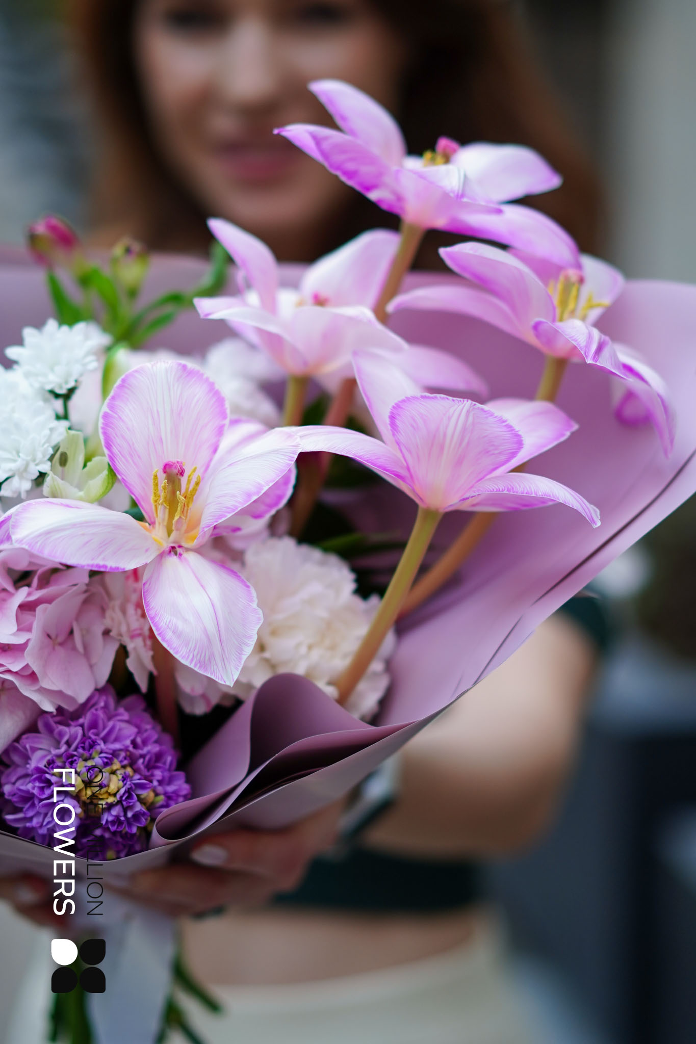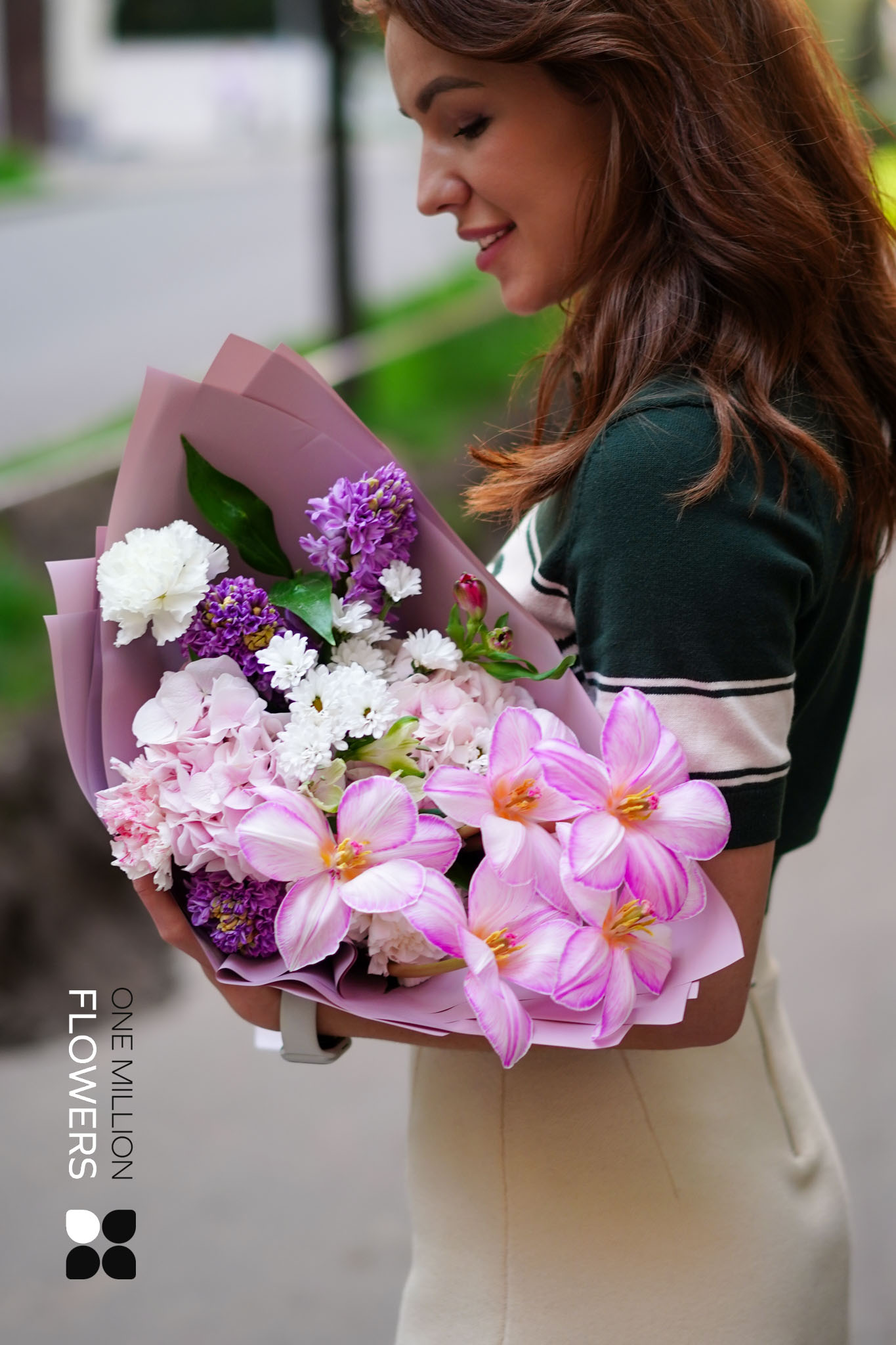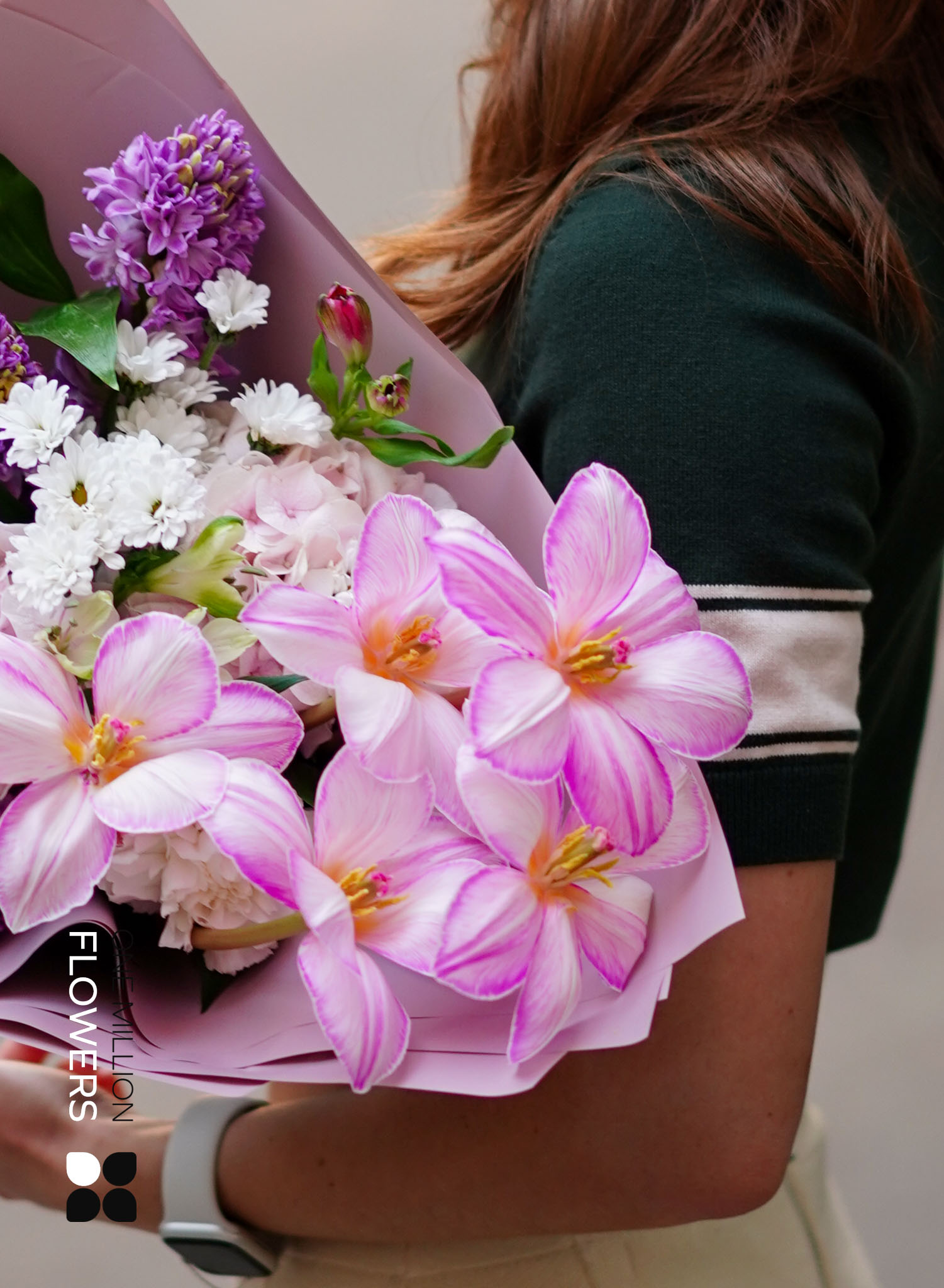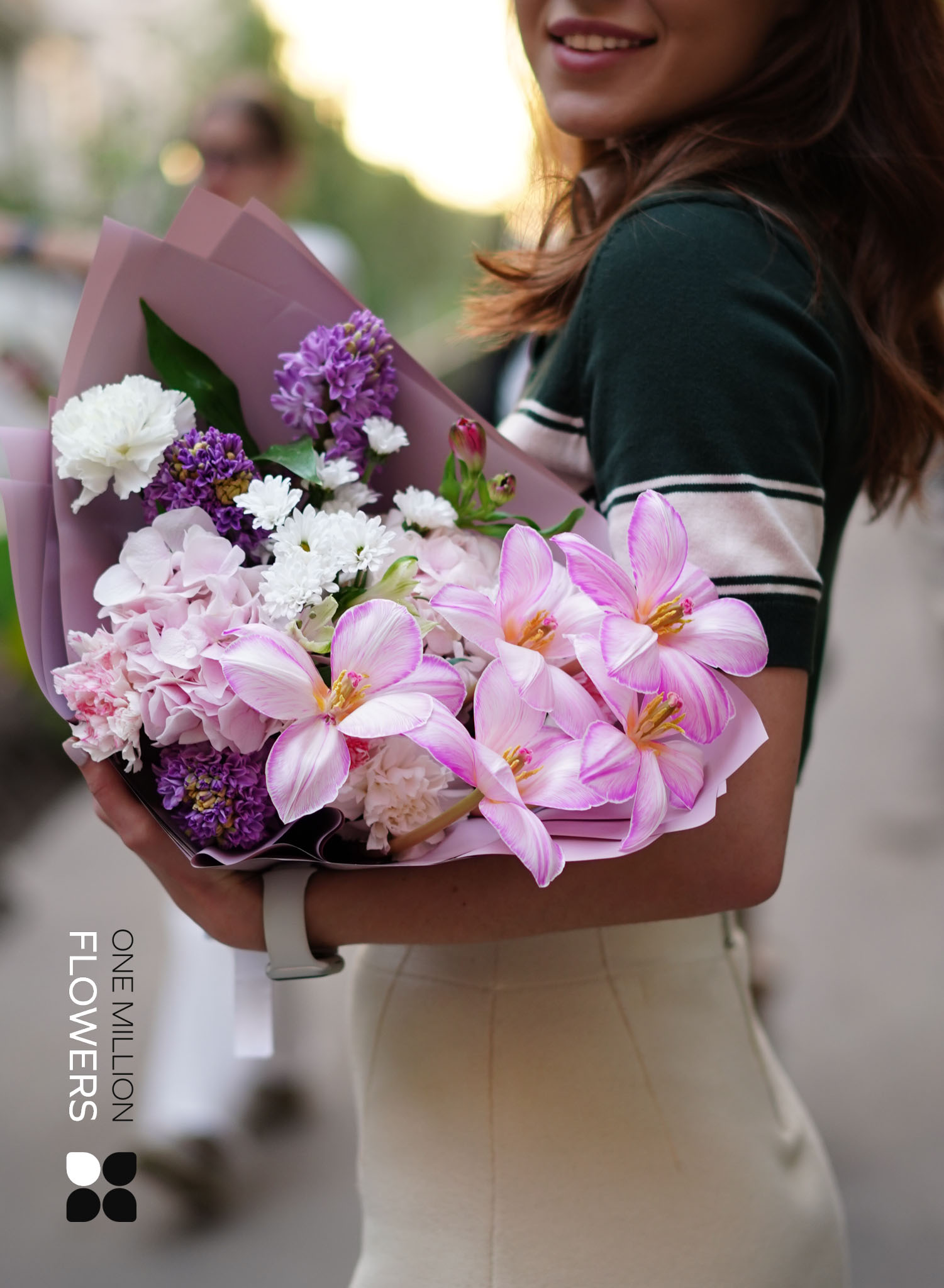 Букет "Флорами" Pink — это настоящий праздник нежности и яркости. В его состав входят: 3 гиацинта, 2 рускуса, 2 белых диантуса (гвоздики), 2 розовых гортензии, 3 розовых диантуса (гвоздики), 5 белых тюльпанов, 3 сантини белых (хризантем) и 2 альстромерии. Это уникальное сочетание создаёт гармонию и радость, даря изысканный вид вашему событию.