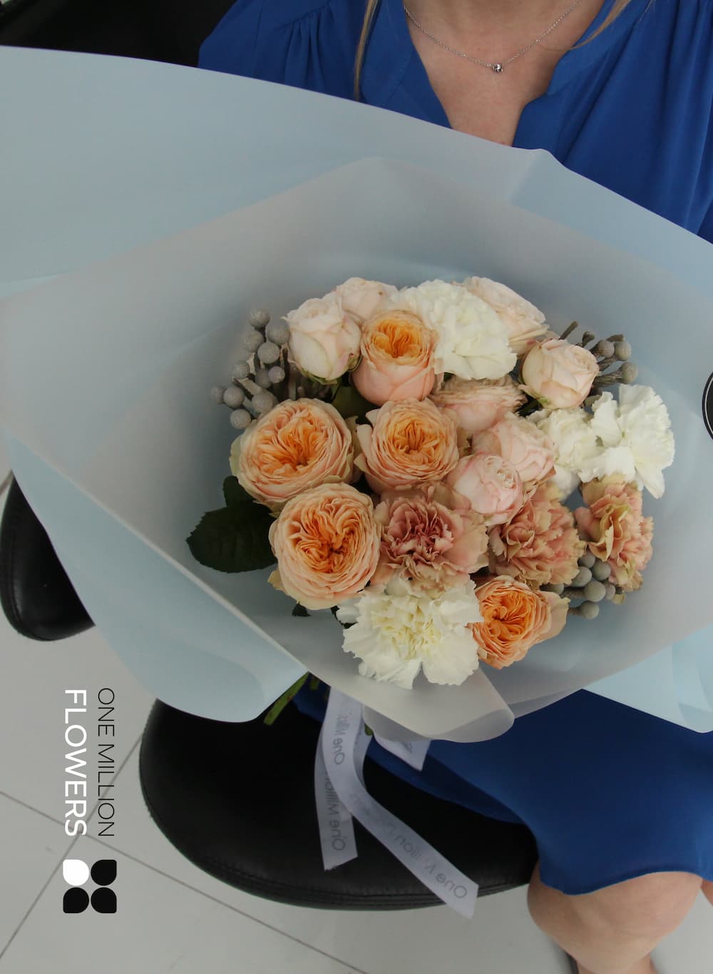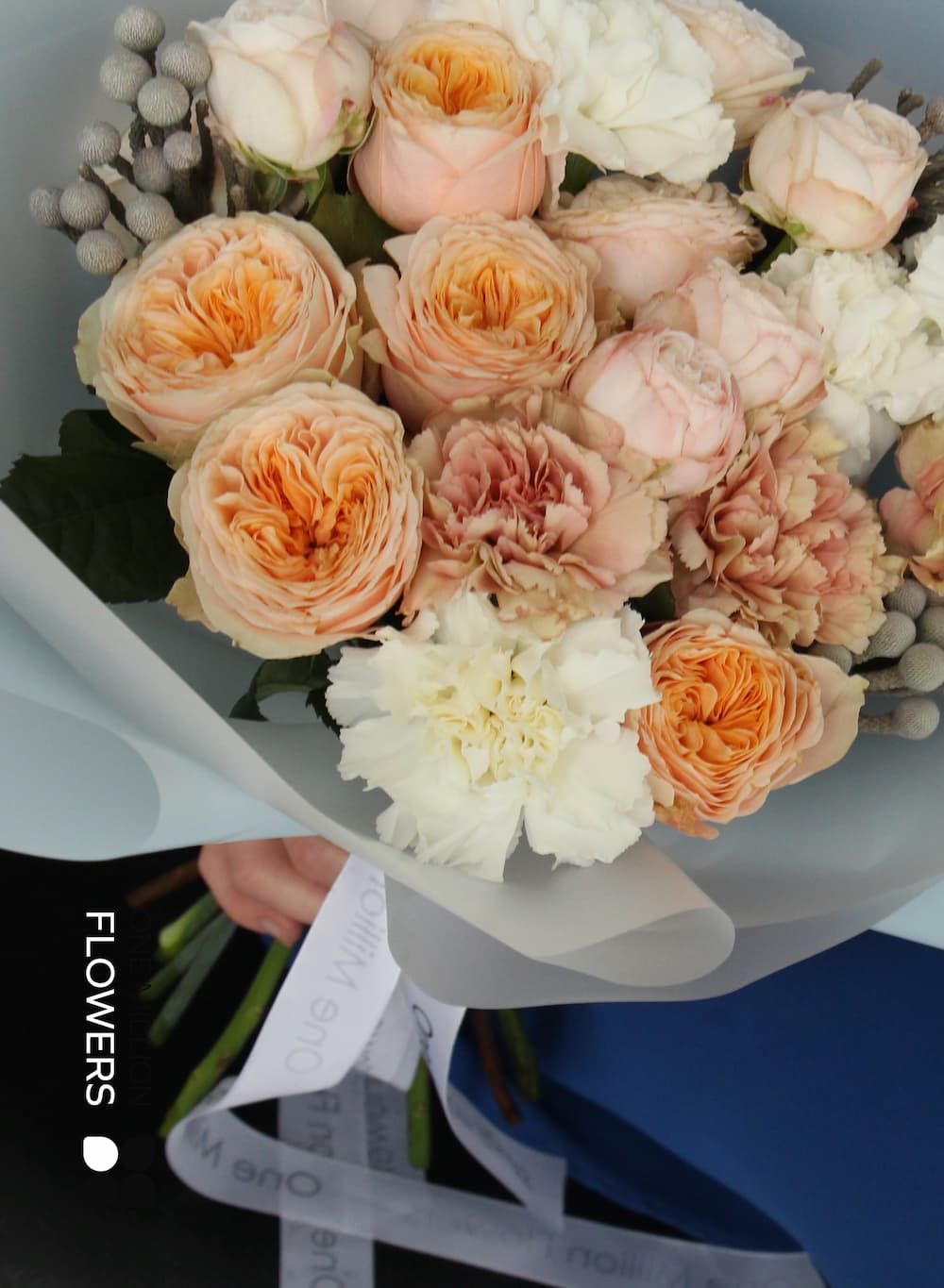 Этот букет — истинное произведение искусства, которое комбинирует в себе нежные оттенки и текстуры, создавая атмосферу уюта и любви.