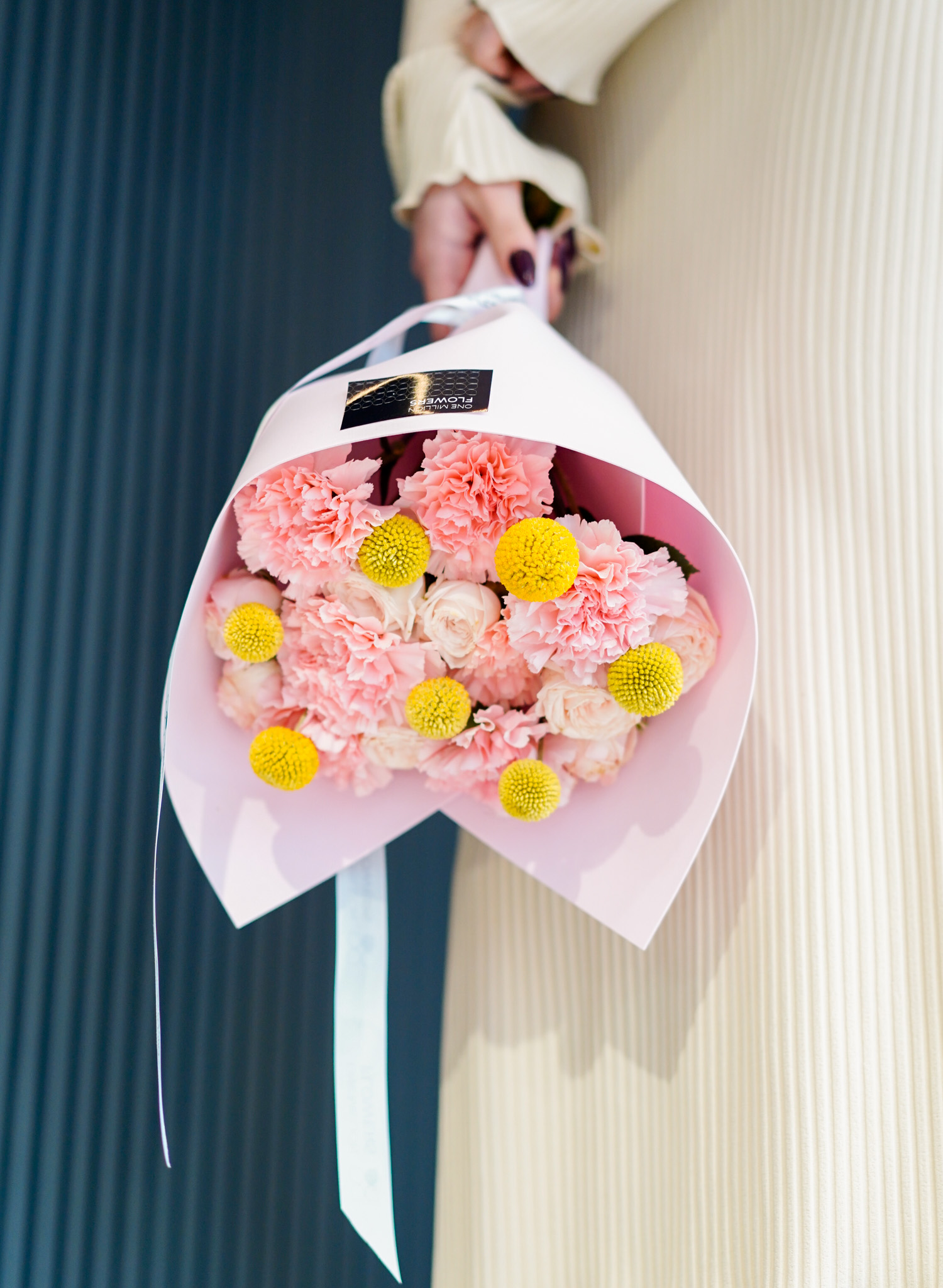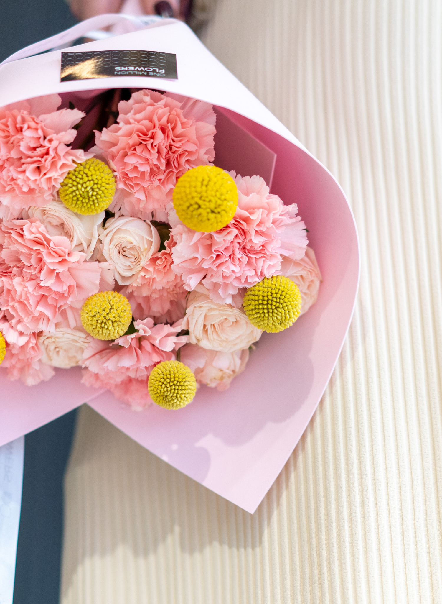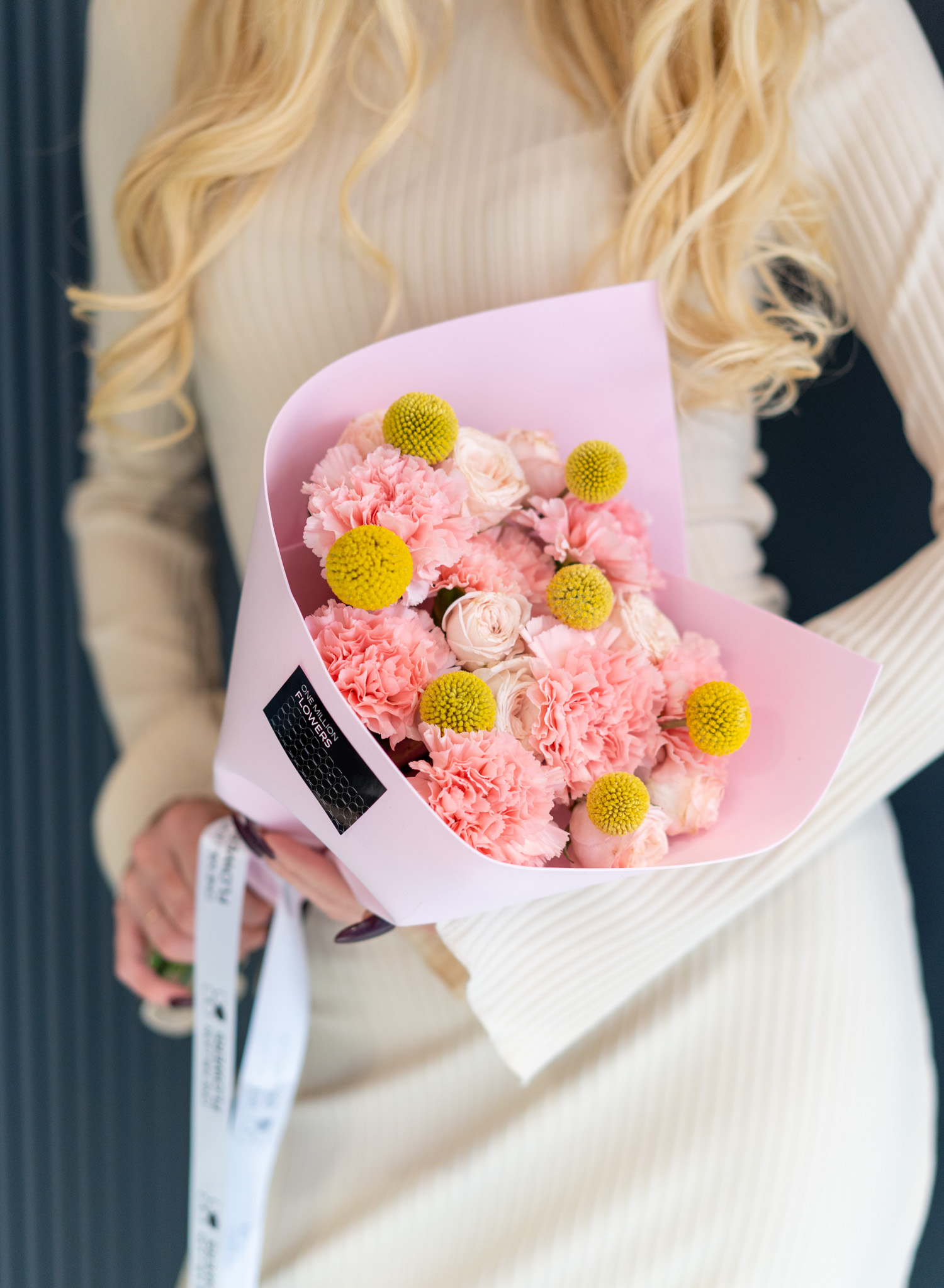 Этот восхитительный букет сочетает в себе изысканность и свежесть. В его состав входят: диантус розовый (гвоздика) – 7 шт., роза кустовая Бомбастик кремовый – 2 шт., краспедия – 7 шт. Такой разнообразный состав создаёт гармоничное цветовое сочетание и интересную текстуру, что делает его идеальным для самых торжественных случаев.