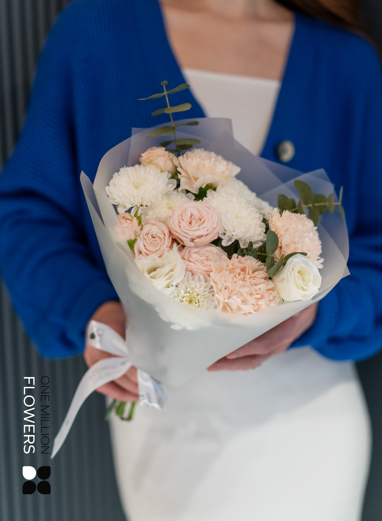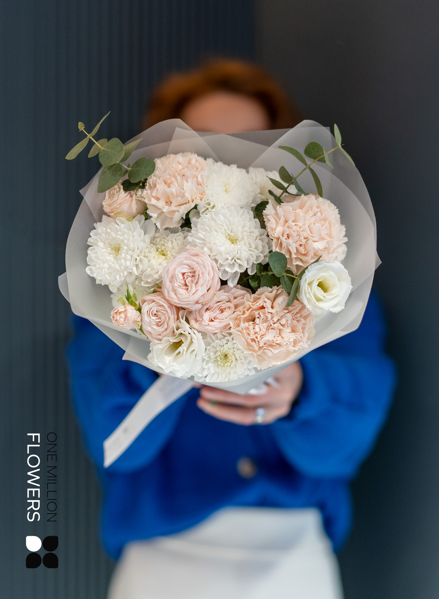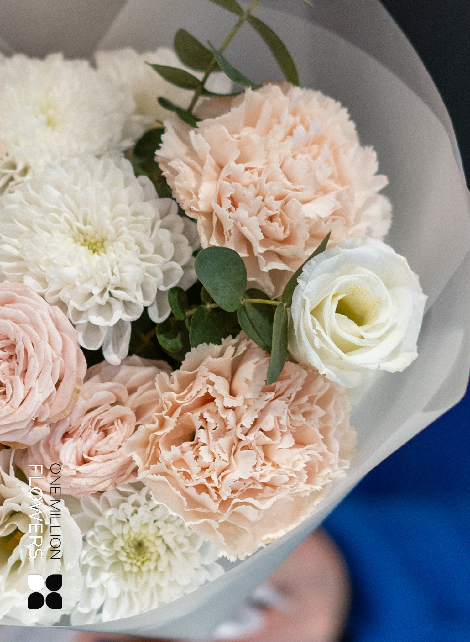 Букет "Лизи Брют" Mate – это незабываемая композиция, включающая в себя три нежные кремовые гвоздики (диантус), один стебель эвкалипта, одну белую эустому, одну кустику белой хризантемы и три кустовые кремовые розы сорта Бомбастик. Это идеальное сочетание цветов создаёт атмосферу легкости и нежности, подчеркивая изящество каждого элемента.
