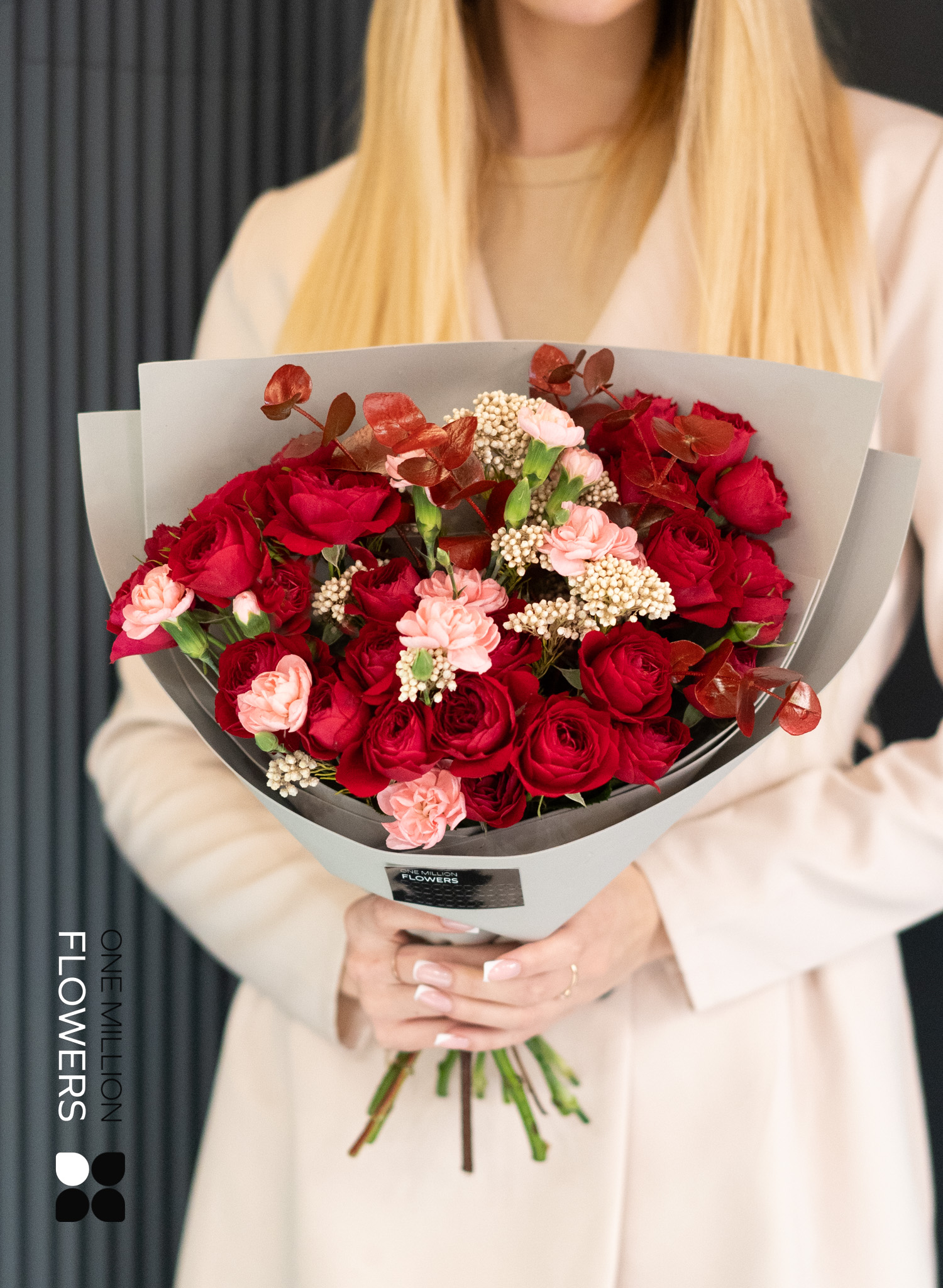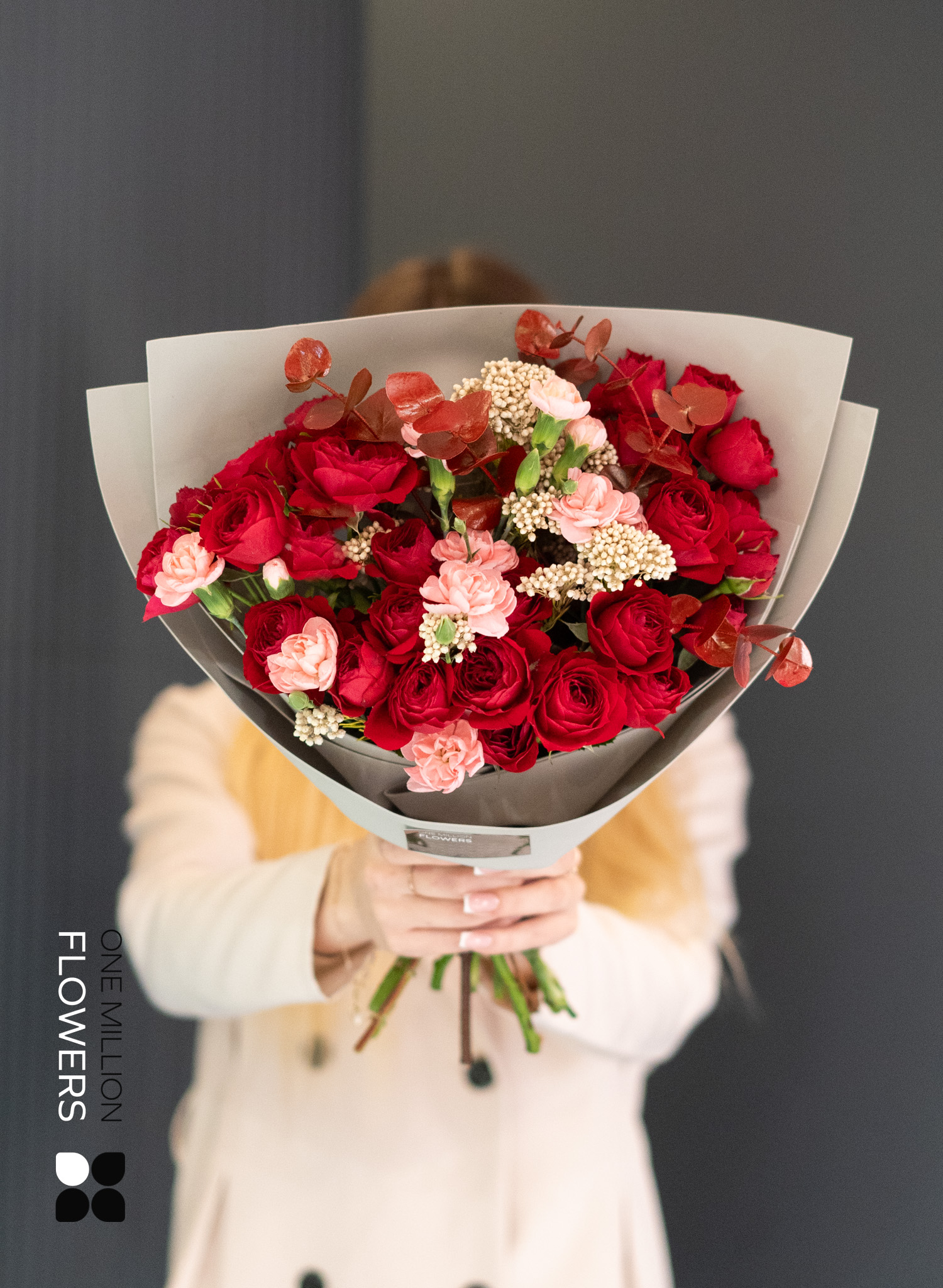 Букет "Луэва Эспо" Gray — это настоящая находка для ценителей изысканной флористики. В сердце этого композиции находятся 7 чудесных кустовых роз Ред трофи, которые своей яркостью и насыщенным красным цветом привносят в букет живую энергетику. Они олицетворяют страсть и романтику, что делает их идеальными для любого торжества или неожиданного сюрприза для близкого человека.
