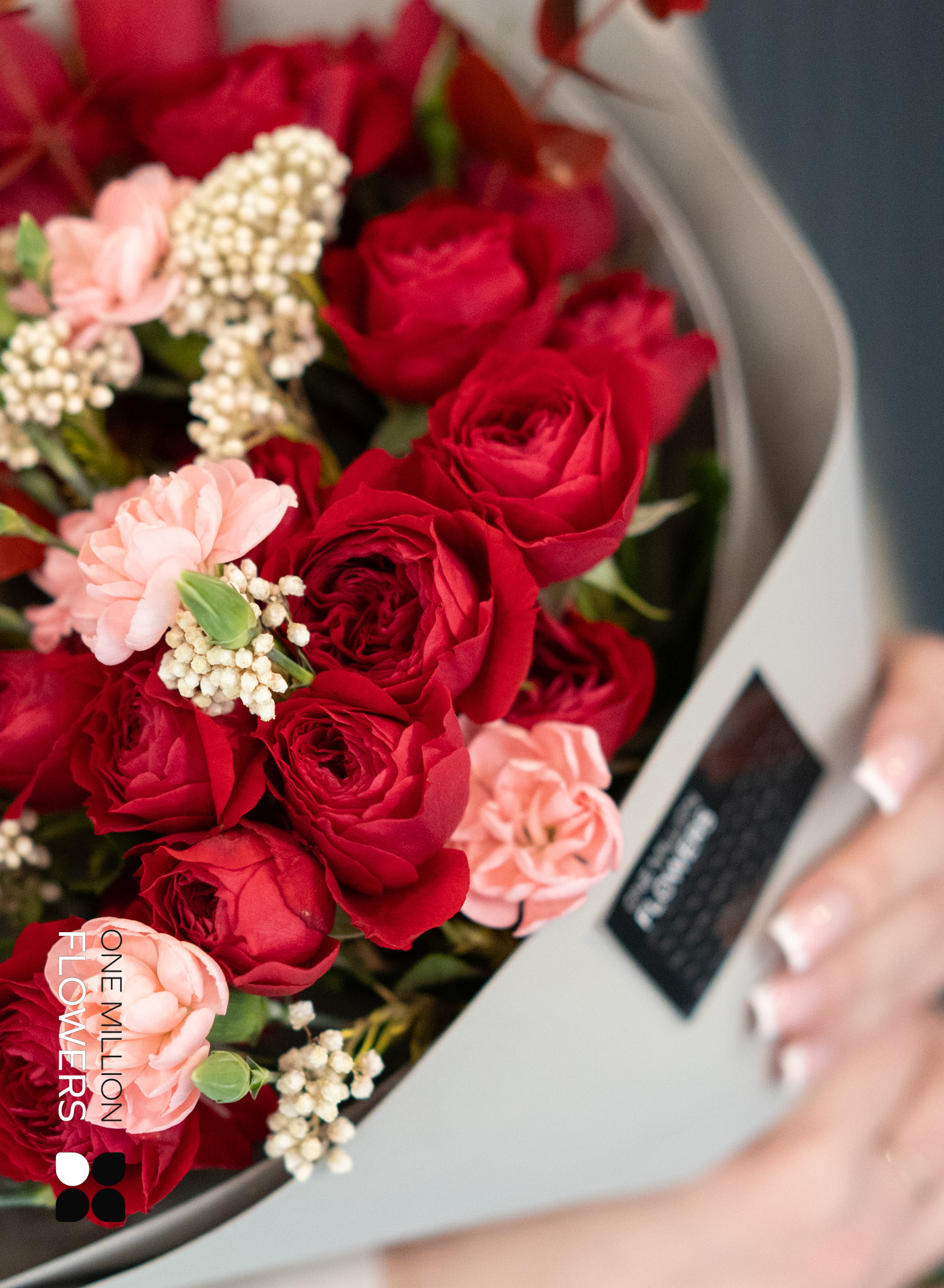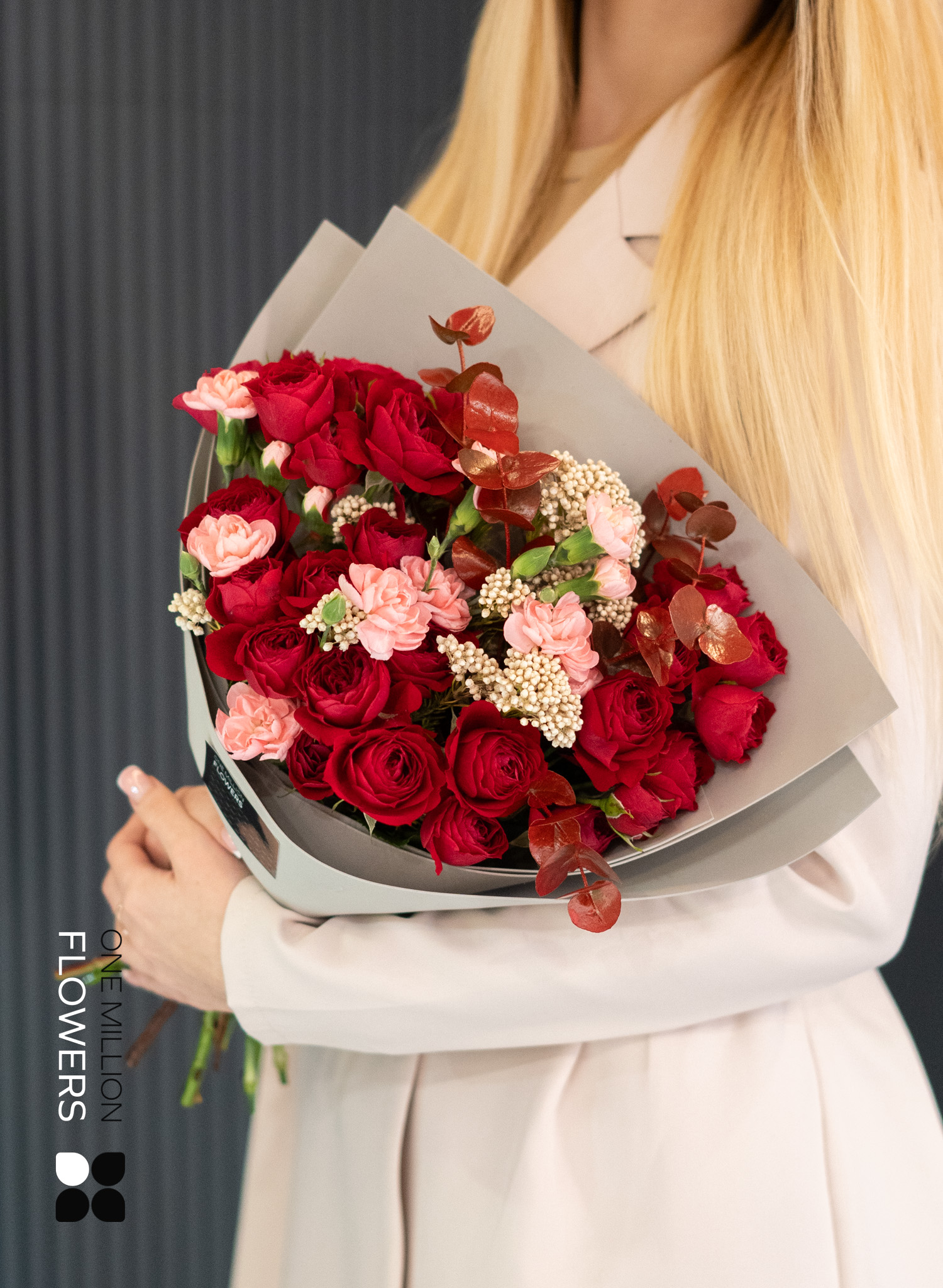 Кроме красных роз, в составе букета "Луэва Эспо" Gray присутствуют 3 кустовых диантуса розового цвета, которые добавляют нотки нежности и яркости, создавая гармонию с основными цветами. Эвкалипт и озатамнус завершают композицию, привнося свежесть и уникальный аромат, который наполняет пространство вокруг цветами. Каждая деталь тщательно подобрана, чтобы создать идеальный баланс и подчеркнуть красоту главных героев букета.