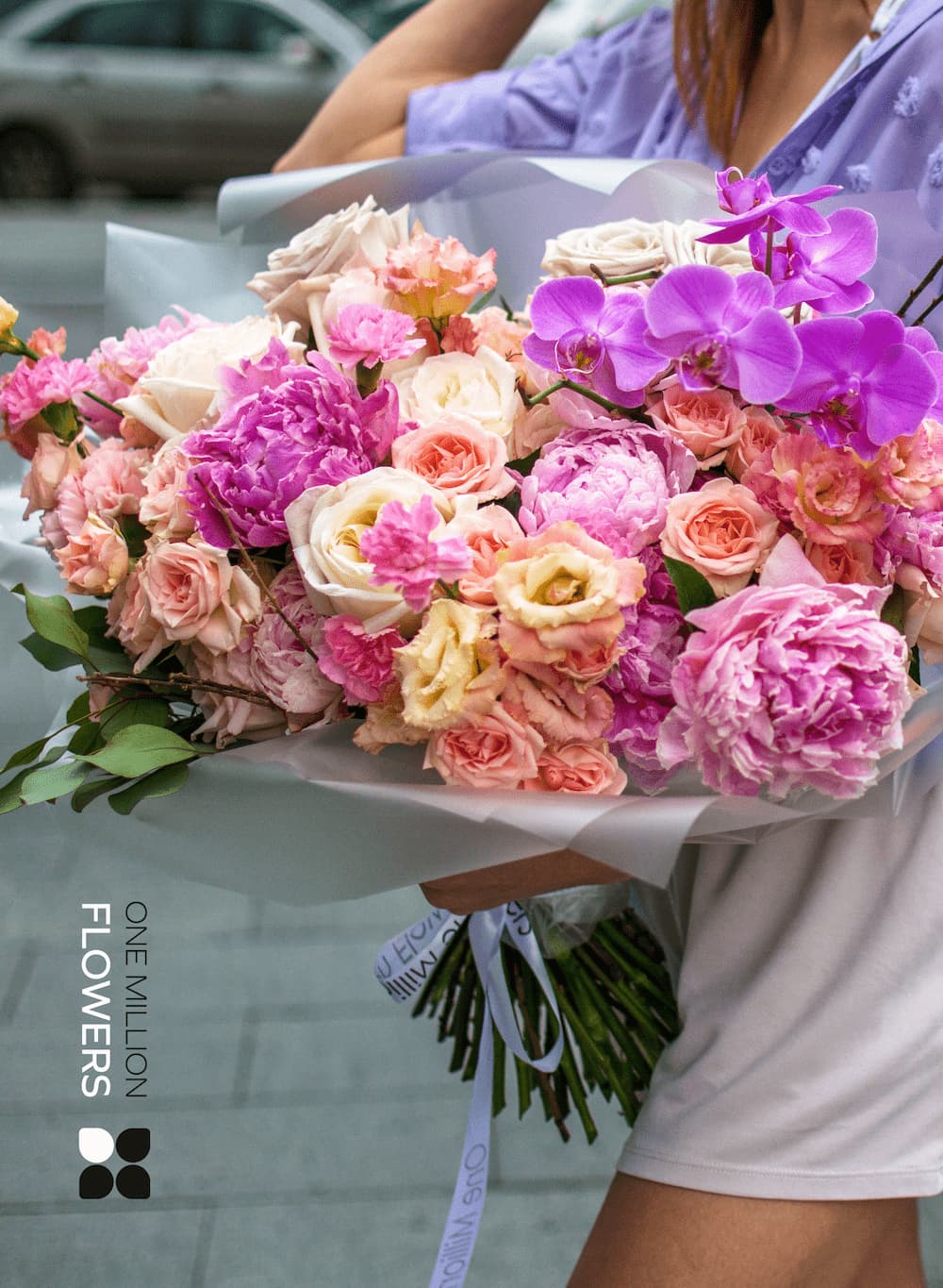 Каждый компонент букета был выбран с заботой и вниманием к деталям. Пионовидные розы дарят нежность и элегантность, а яркие диантусы добавляют оригинальности. Эвкалипт и кустовые розы дополняют общий стиль и подчеркивают богатство выбора.