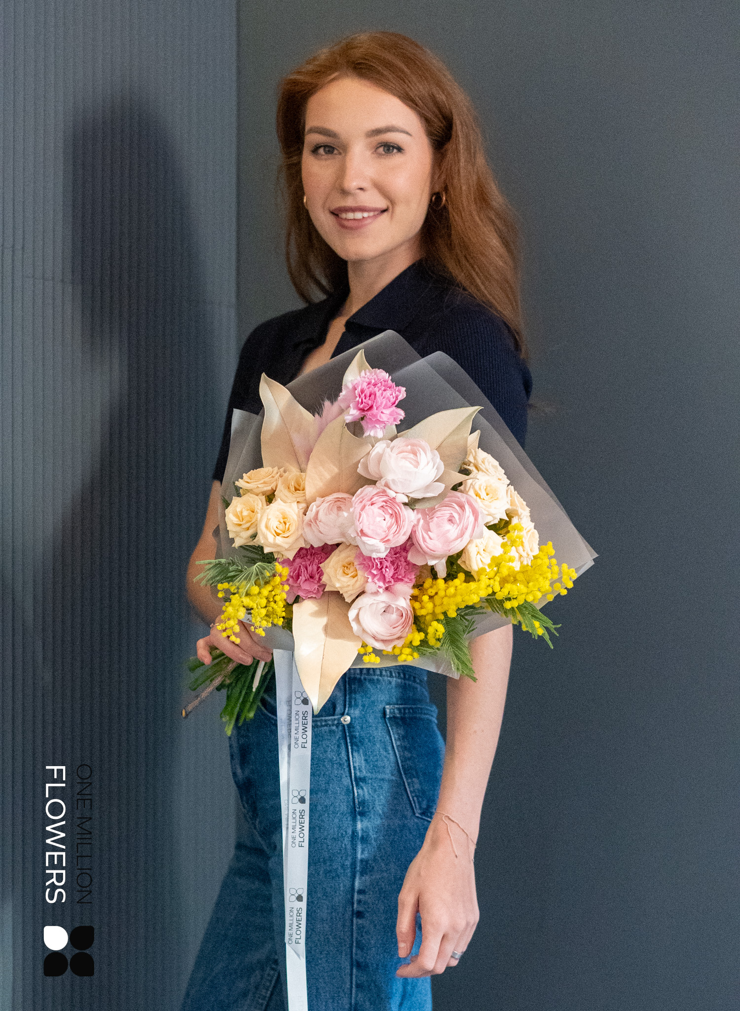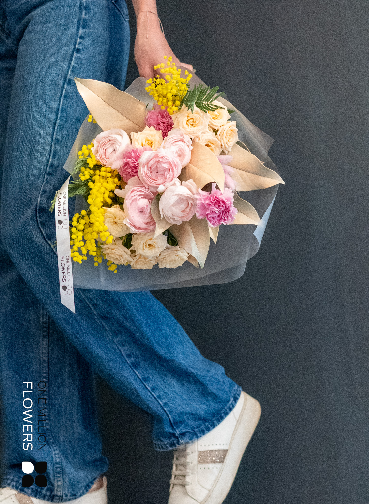 В букете "Нейми" Mate вы найдете: 5 розовых ранункулюсов, 3 кремовых диантуса (гвоздики), 2 мимозы, 3 кустовые розы Свит Сара (кремовые) и 1 магнолию. Каждый элемент был тщательно выбран для создания идеальной композиции. Ранункулюсы с их нежными лепестками и гвоздики придают букету изысканный шарм. Мимоза добавляет легкость, а кремовые розы олицетворяют элегантность и праздничное настроение.