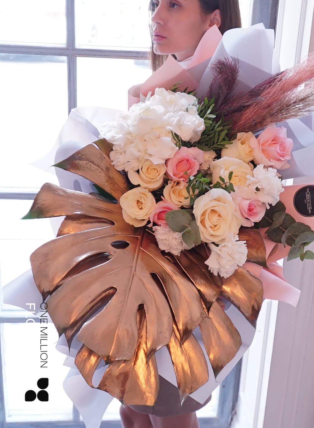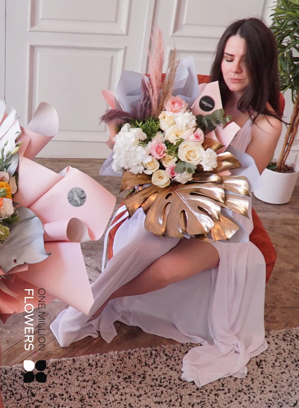 Букет "Ортего Голт" Pink — это настоящая симфония нежных оттенков и приятных ароматов. В его состав входят: 7 белых роз (Роза Белая 40), 5 белых диантусов, 5 пионовидных роз Пинк Охара, 1 веточка эвкалипта и 1 писташ, добавляющие свежесть и зелень. Три листа монстеры создают неповторимую текстуру, а 5 сухоцветов кортадерии придают букету стиль и оригинальность. Завершает композицию белая гортензия, которая становится изюминкой всего букета.