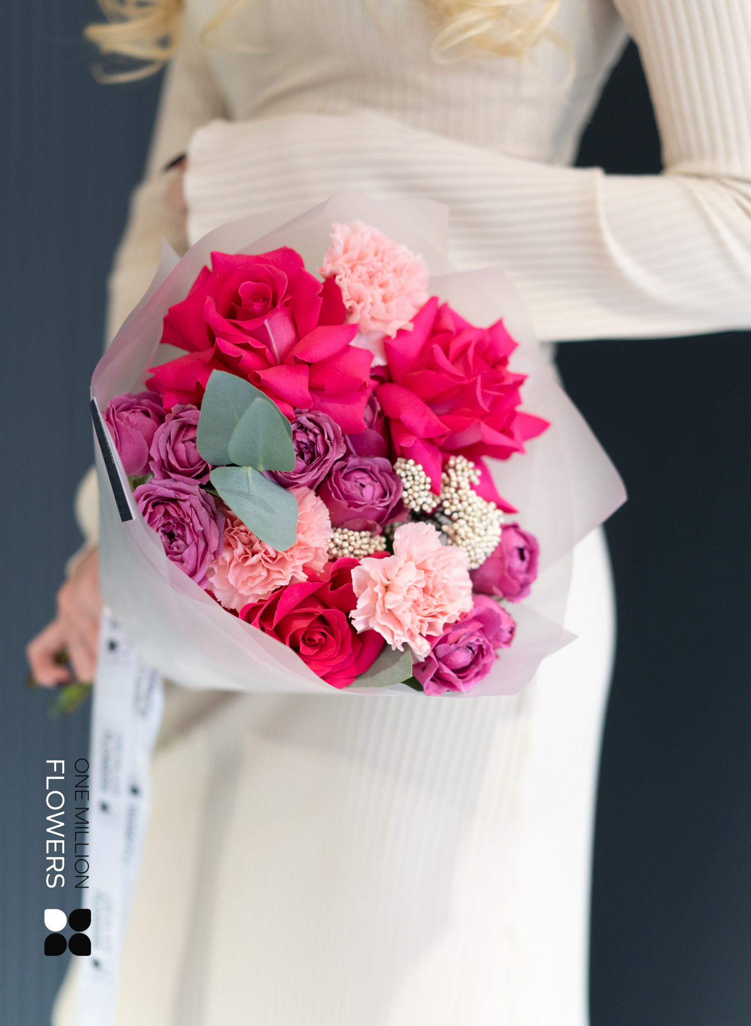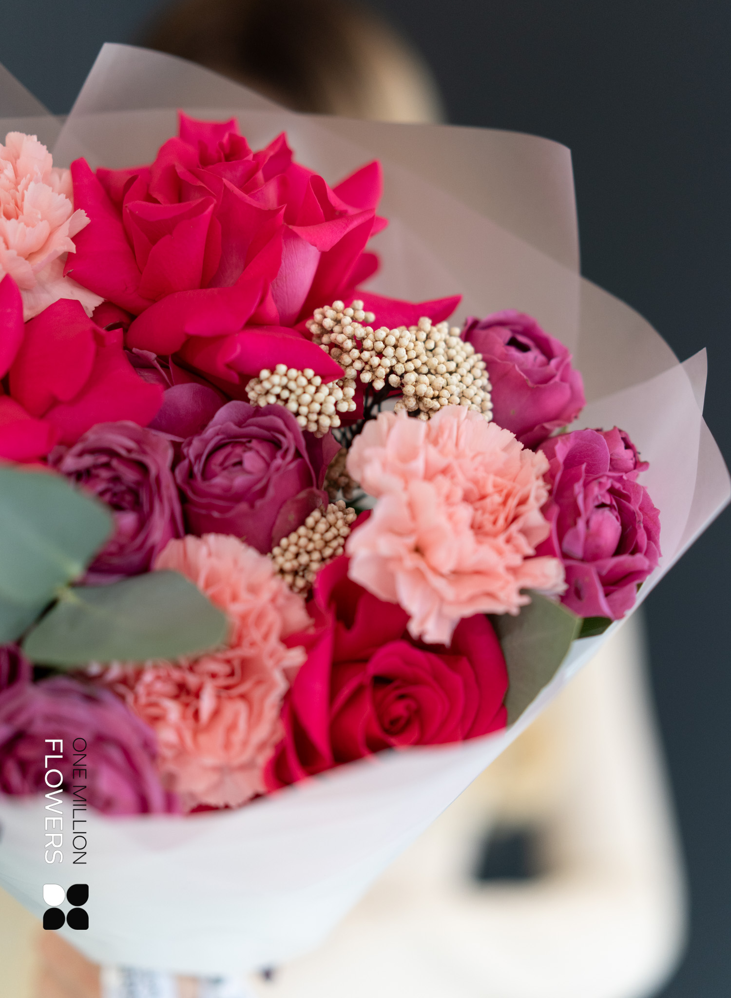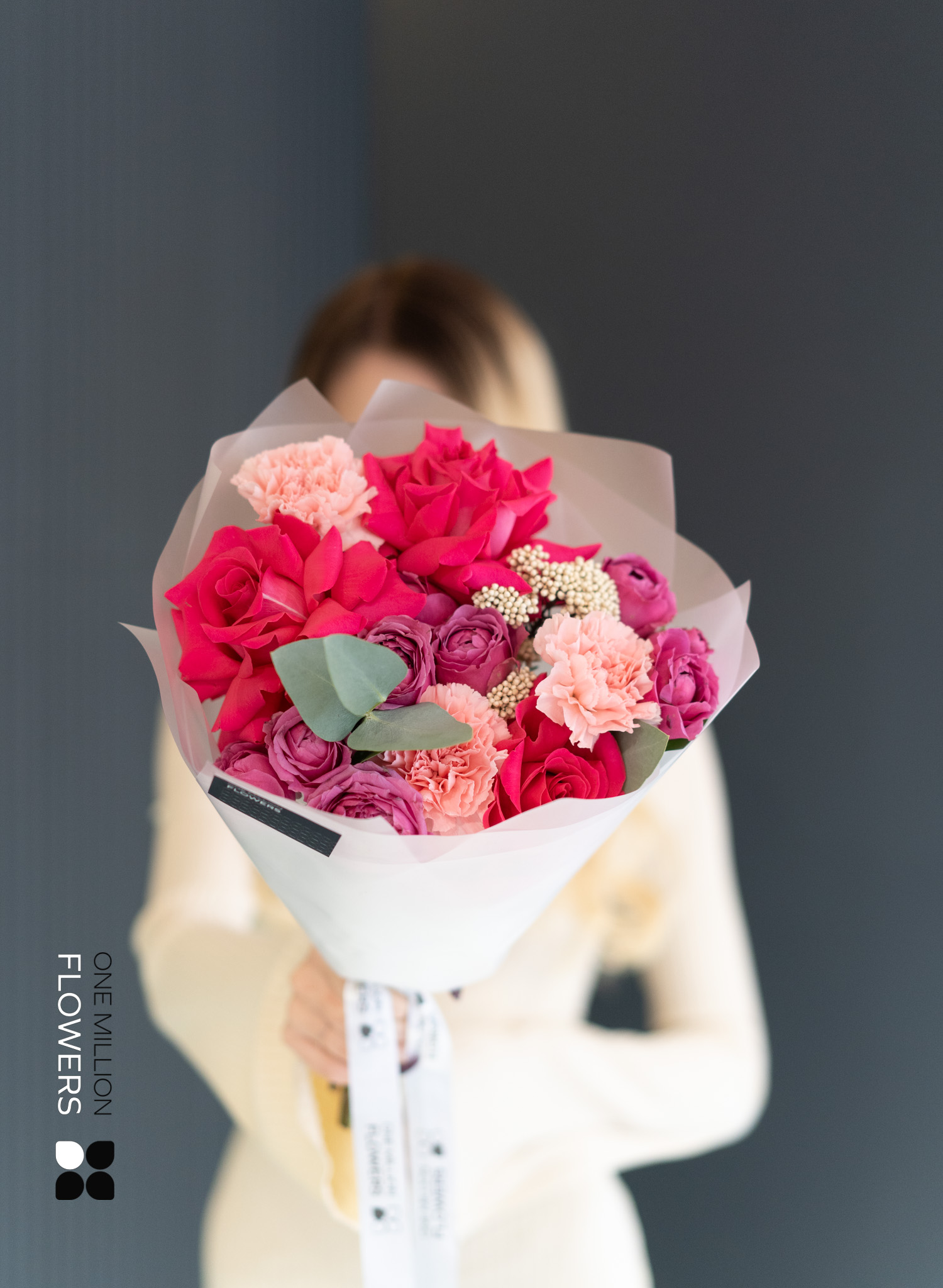 В основе композиции — изящные эустомы, известные своей элегантностью и стойкостью. Их оттенки колеблются от дымчато-розового до лавандового, создавая загадочное настроение. Дополняют букет веточки эвкалипта и сезонная зелень, которые придают ему воздушность и динамику. Это идеальный баланс между современным флористическим дизайном и естественной красотой.