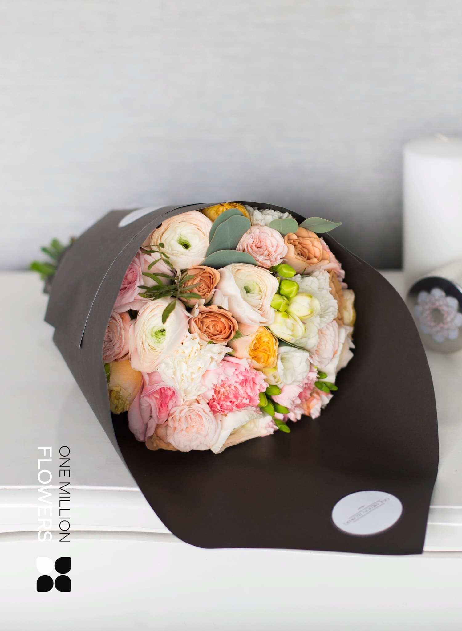 Букет "Пармеджано" Black — это изысканная композиция, гармония различных оттенков и текстур. В состав букета входят 4 пионавидные розы Вайт Охара, 6 белых фрезий, 4 розовых диантуса (гвоздики), 4 белых ранункулюса, 7 роз Капучино и 8 кустовых роз Бомбастик Кремовых. Уникальные акценты создают 2 веточки эвкалипта и 2 писташей, придавая букете свежесть и утонченность.