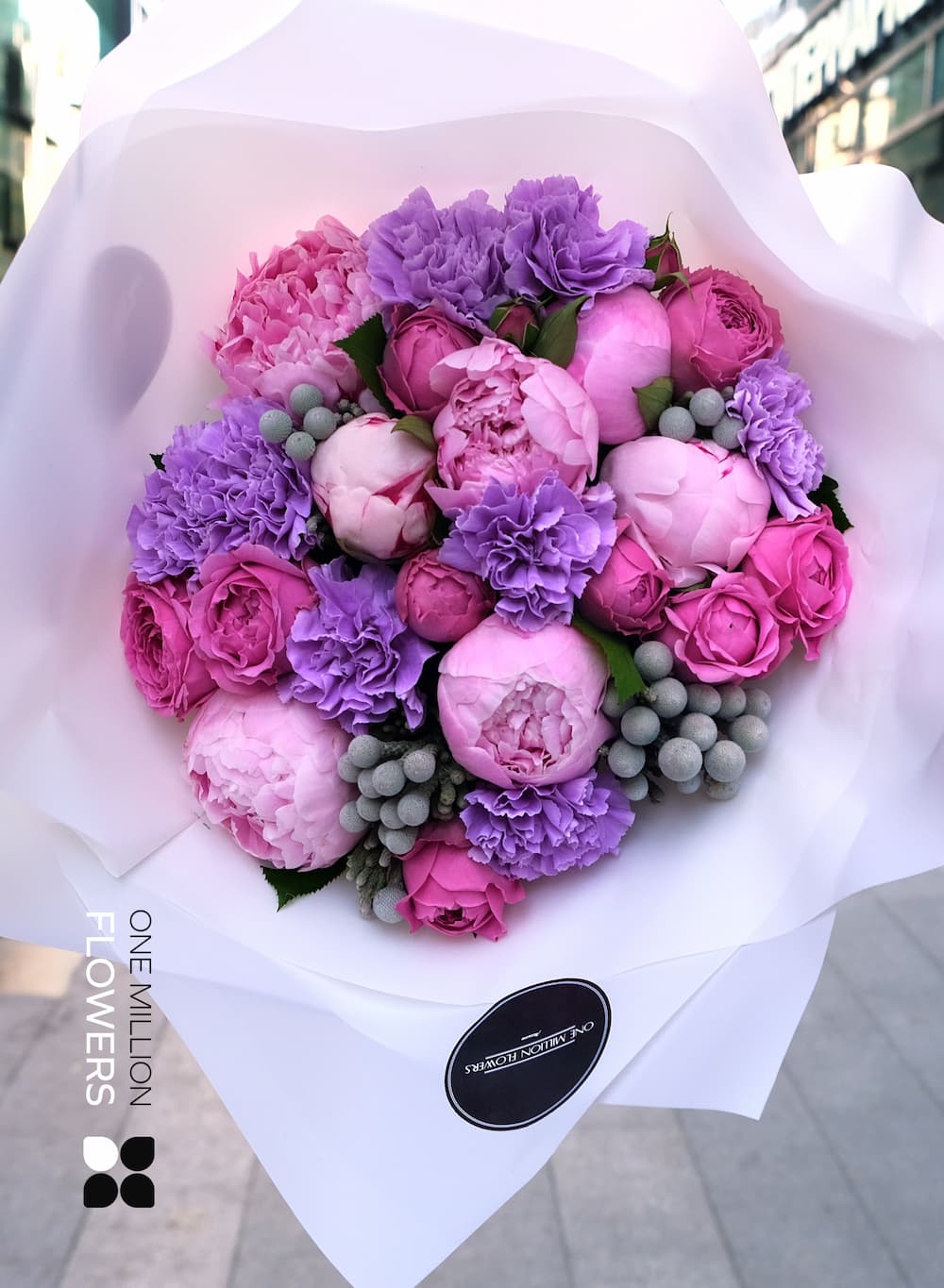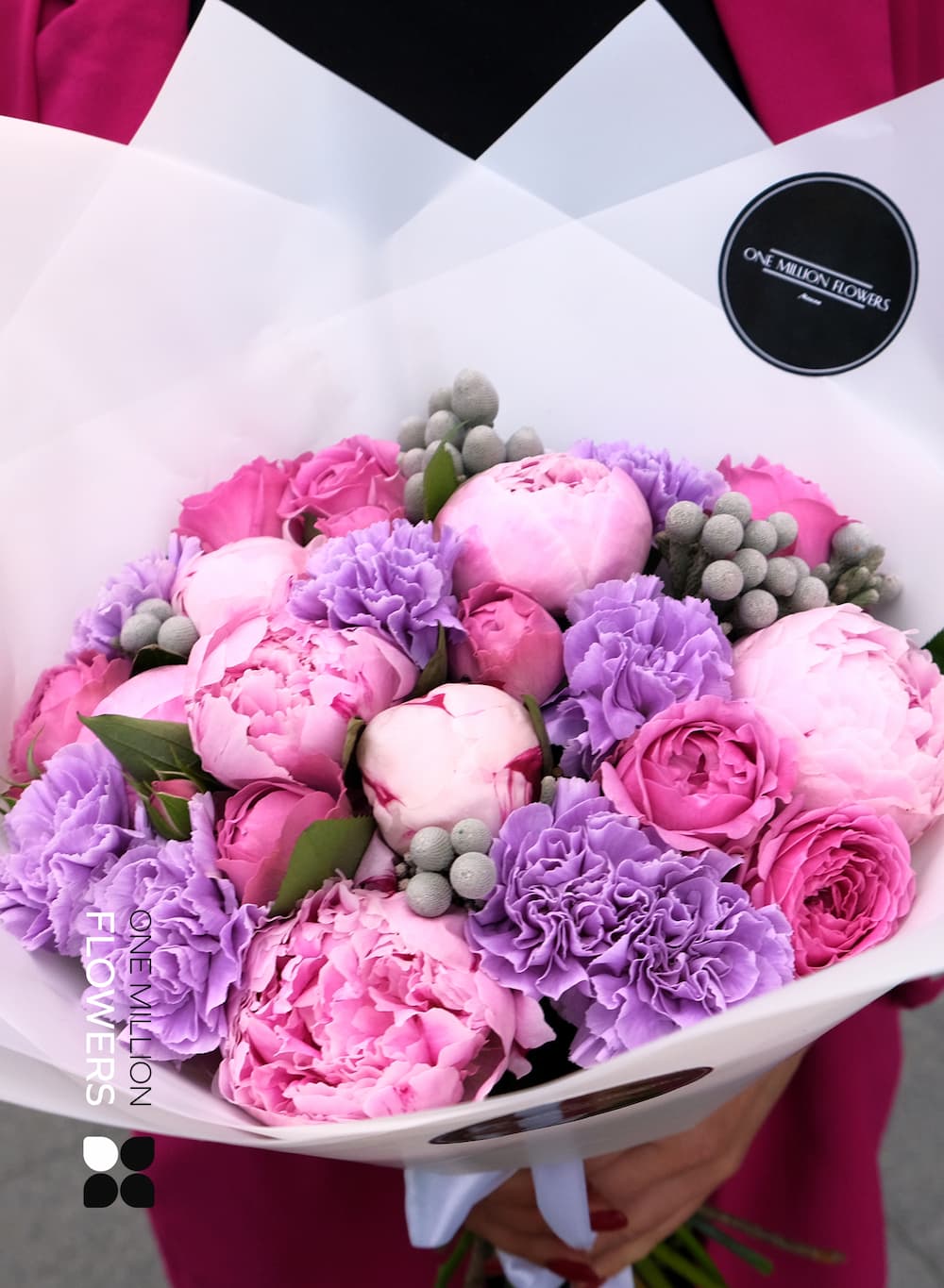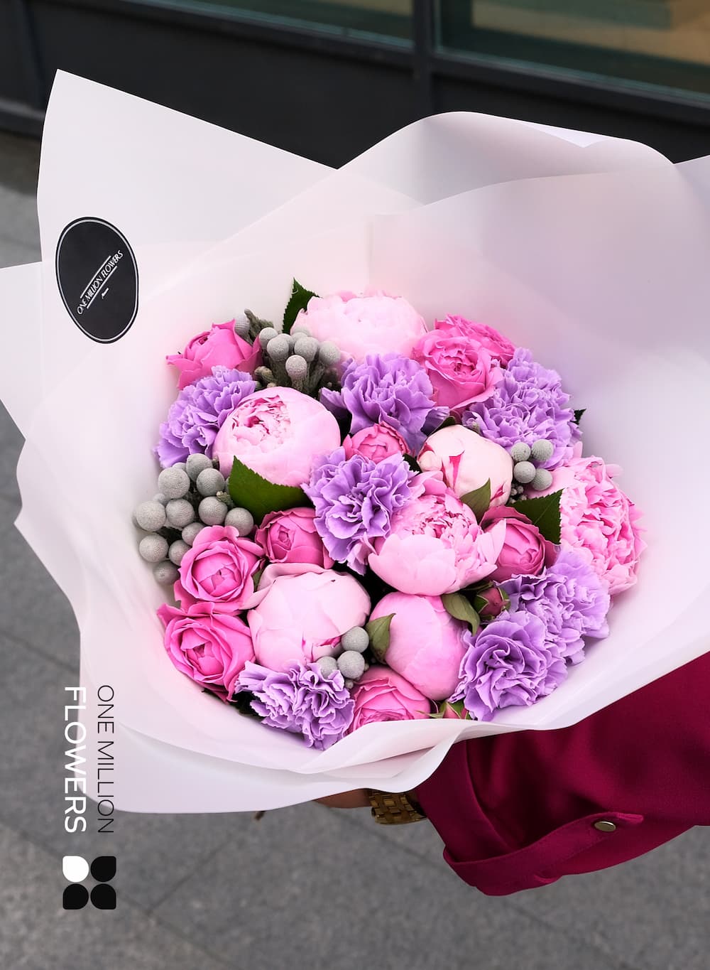 Букет "Пула Солт" White — это роскошное сочетание нежности и ярких эмоций. В его состав входят 7 шт. розовых пионов, 5 шт. кустовых роз сорта Мисти Баблз, 9 шт. сиреневых диантусов (гвоздик) и 4 шт. брунии. Каждый элемент добавляет свою нотку в общую гармонию букета, создавая эффектный и запоминающийся образ.