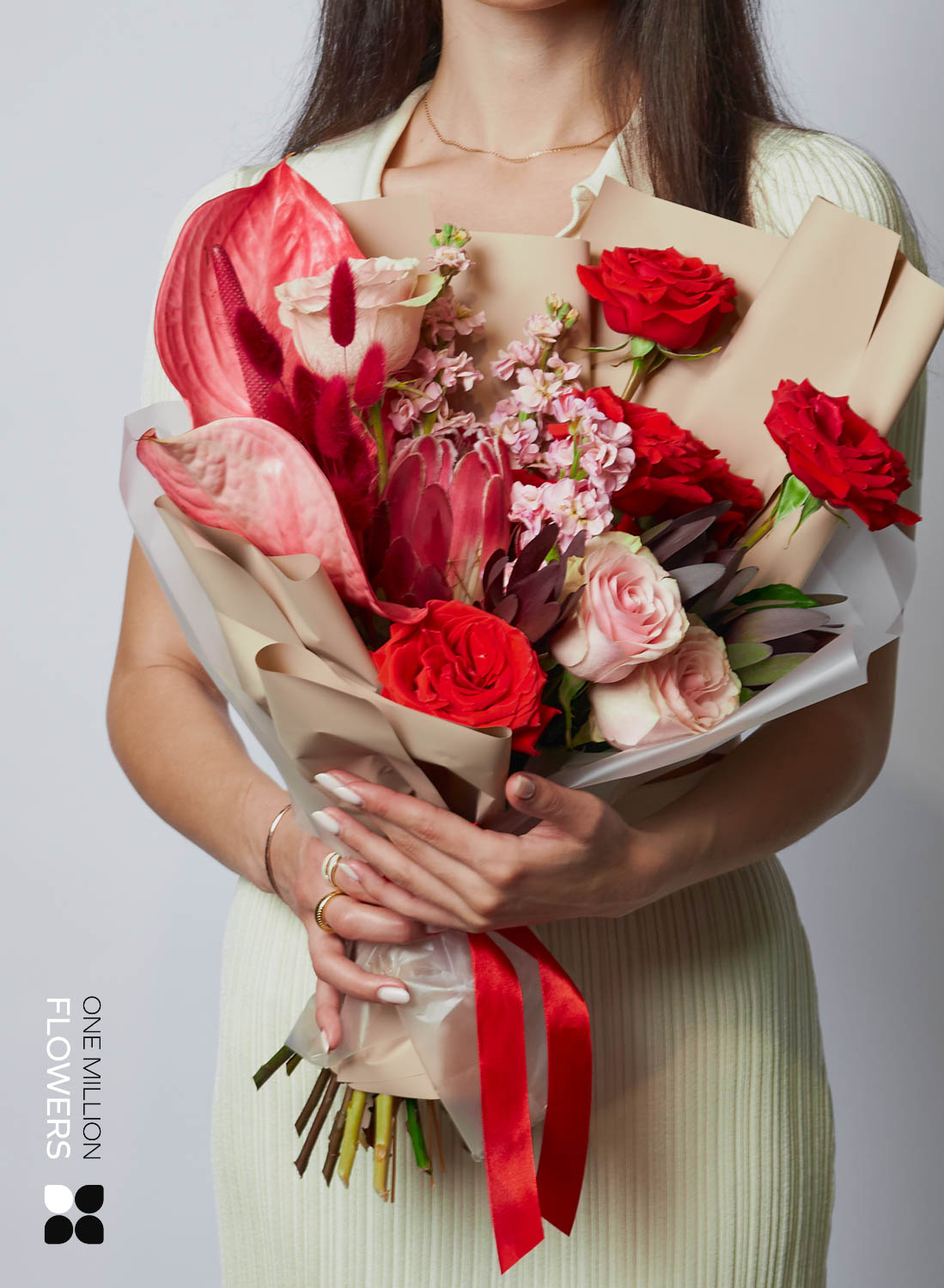 Букет "Ред Раннер" Cream — это не просто композиция, это настоящая цветочная симфония, созданная с любовью и вниманием. Этот букет состоит из различных растений, каждый из которых привносит свою уникальную ноту в общую гармонию. Маттиола розовая и роза Красная 50 в сочетании создают теплую атмосферу, а антуриум и протея добавляют яркие акценты, способные вызвать восхищение.