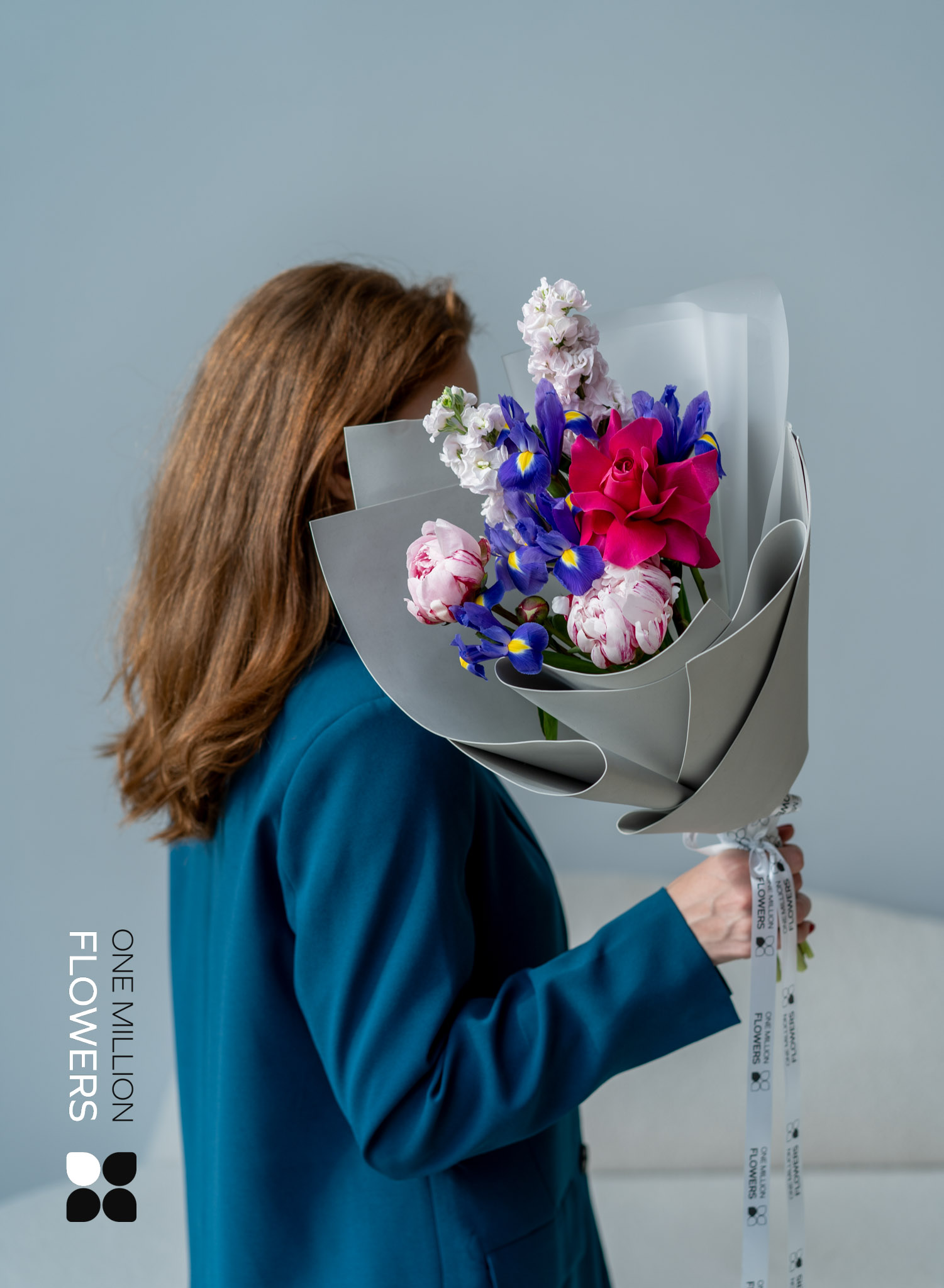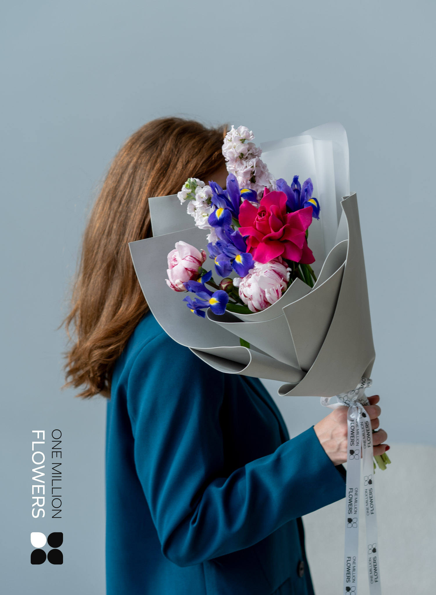 Этот великолепный букет "Сара Х Блю" станет настоящим украшением любого праздника. В его составе — три розовые маттиолы, символизирующие нежность и искренность чувств. К ним добавлены две эквадорские розы сорта Пинк Флойд, которые поражают своей легкостью и утонченностью. Завершает композицию три пионовидных цветка, придающих букету роскошный вид. Не забыли о выразительных синих ирисах — их семь штрихов, создающих яркое настроение и контраст с нежными пигментами других цветов.