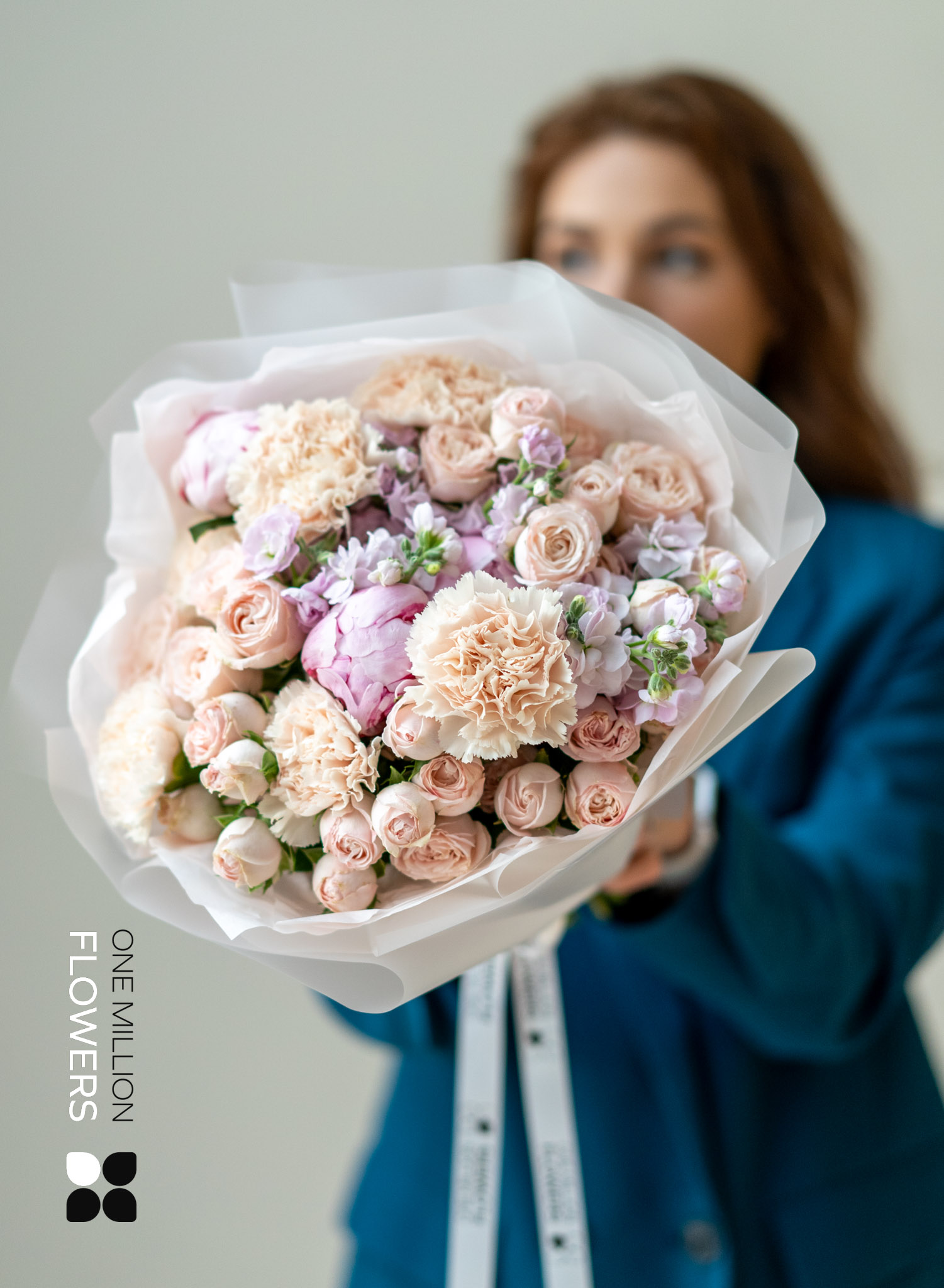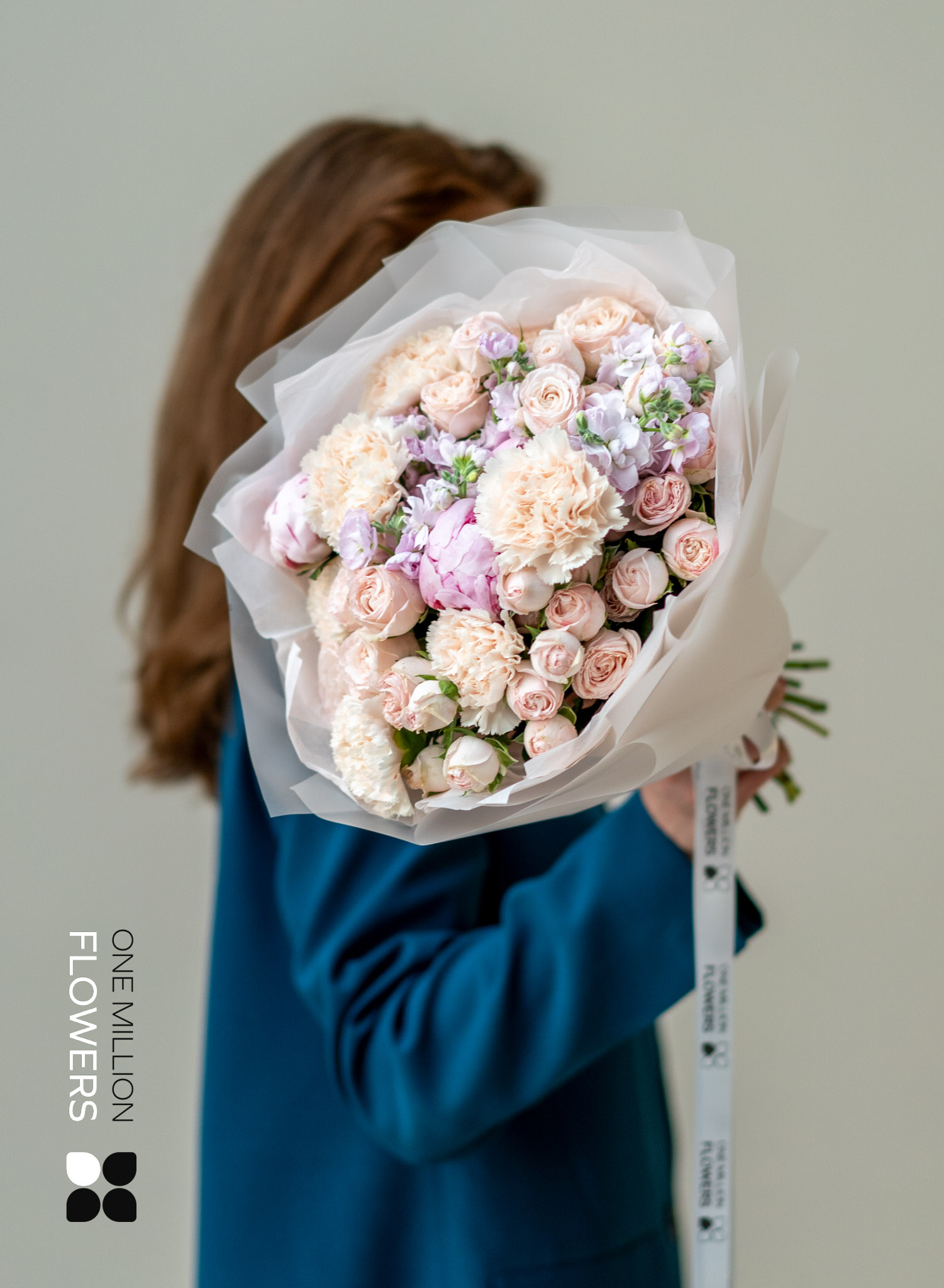 Букет "Свит Арно" White — это восхитительная композиция, созданная для самых требовательных ценителей. Его основа состоит из двух розовых маттиол, символизирующих нежность и романтику. Пять кремовых диантусов добавляют изысканности, а три розовых пиона дарят сладкий, восхитительный аромат, создавая атмосферу уюта и тепла. Завершает этот великолепный ансамбль семь кустовых роз Бомбастик кремового оттенка, которые придают букету особую выразительность и благородство.