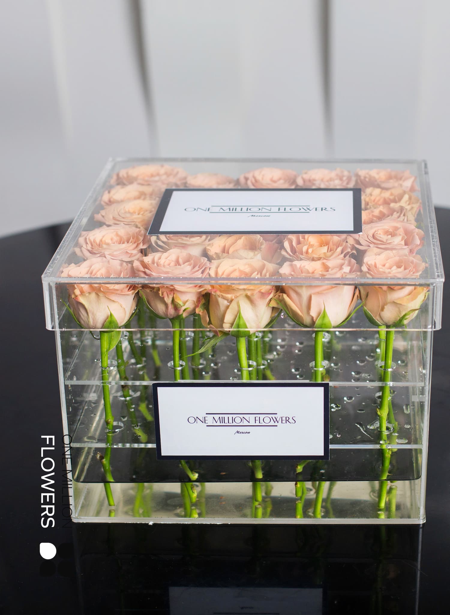 В состав бокса входят 25 шт. роз Капучино, которые радуют своей элегантностью и неповторимым цветом. Стеклянный бокс, в который помещены цветы, не только подчеркивает их красоту, но и служит долговечным оформлением, которое можно использовать повторно. Этот набор идеально подходит как для подарка, так и для личного наслаждения.