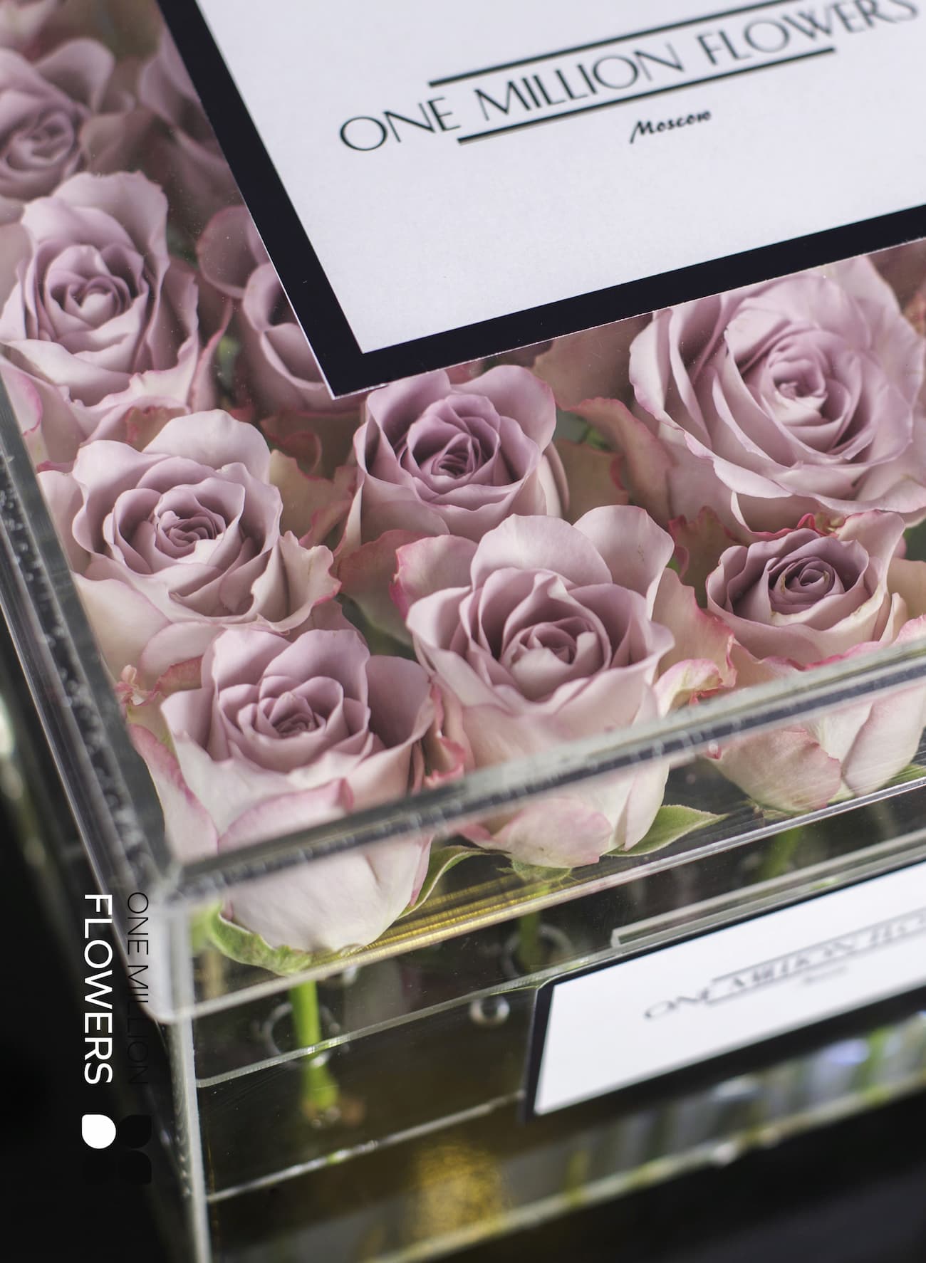 Ваш бокс состоит из 25 великолепных роз: насыщенные фиолетовые бутоны создают яркий акцент, который невозможно не заметить. Эти цветы аккуратно помещены в элегантный стеклянный бокс, который подчёркивает их величие и силу. Стеклянный бокс не только защищает цветы, но и служит стильным элементом декора, который будет радовать глаз долгое время.