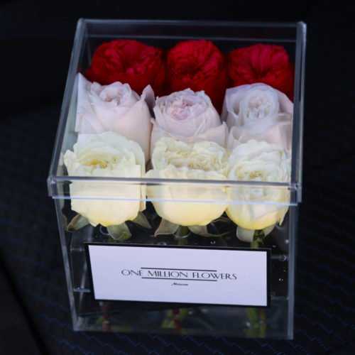 Бокс "Крим Бордо" — это истинное цветочное произведение искусства, состоящее из девяти великолепных пиономидных роз. В этот элегантный букет входят три розы сорта Вайт Охара, три розы Ред Пиано и три розы Пинк Охара. Каждая из этих роз, благодаря своим насыщенным цветам и волшебному аромату, приносит радость и восхищение, мгновенно наполняя пространство атмосферой любви и нежности.