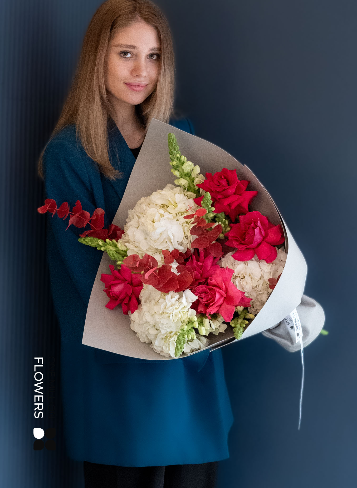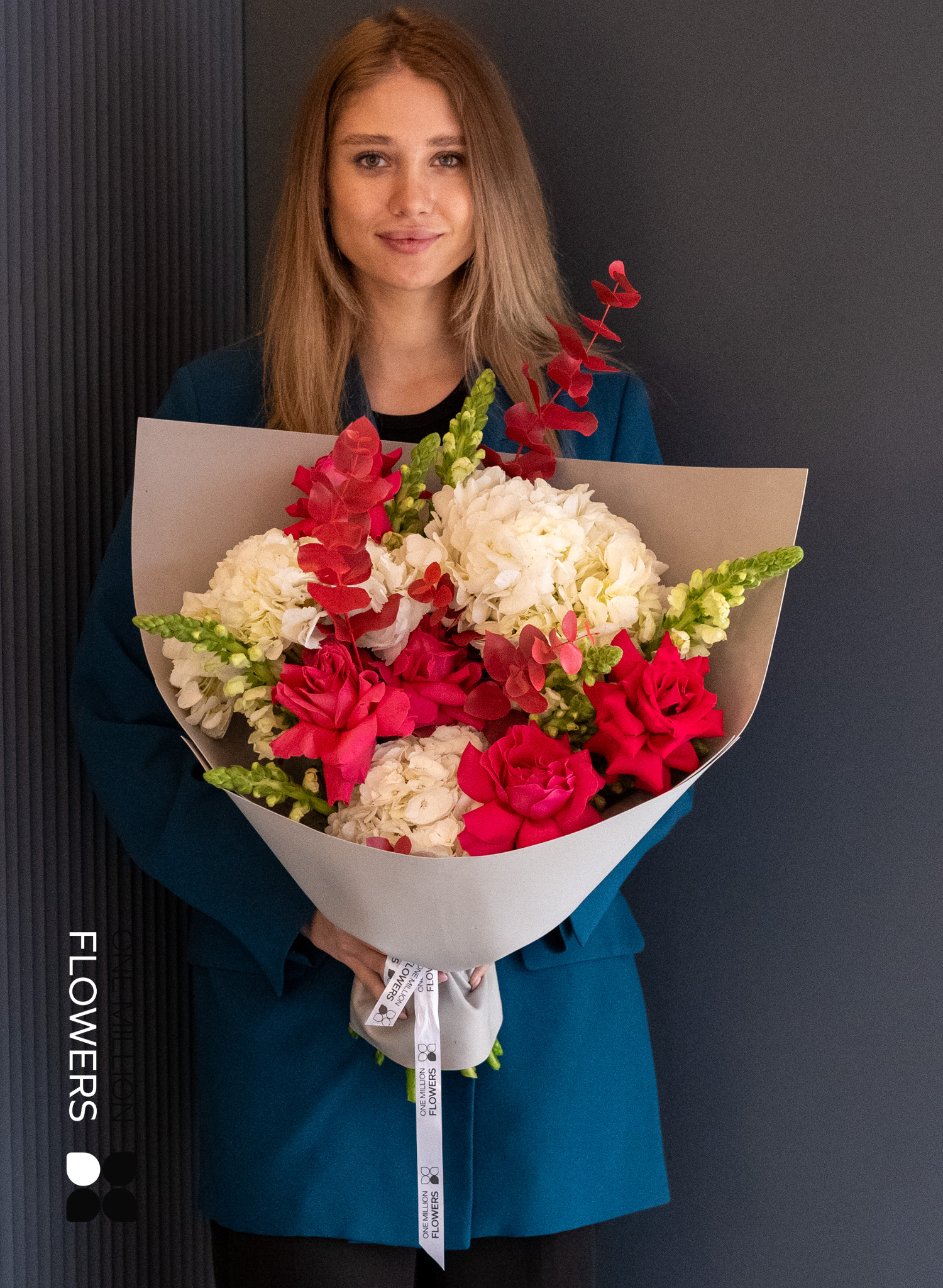 "Салун Пинк" Grey — это тонкий баланс между нежностью и сдержанным стилем. В составе: розовые кустовые розы, ранункулюсы, эустомы и сезонная зелень, обёрнутые в дизайнерскую бумагу серого цвета. Такой букет словно вырван из модной фотосессии: он минималистичен, элегантен и подчёркнуто современный. Оттенки розового будто подсвечиваются серым фоном, придавая композиции глубину и лёгкую драматичность.