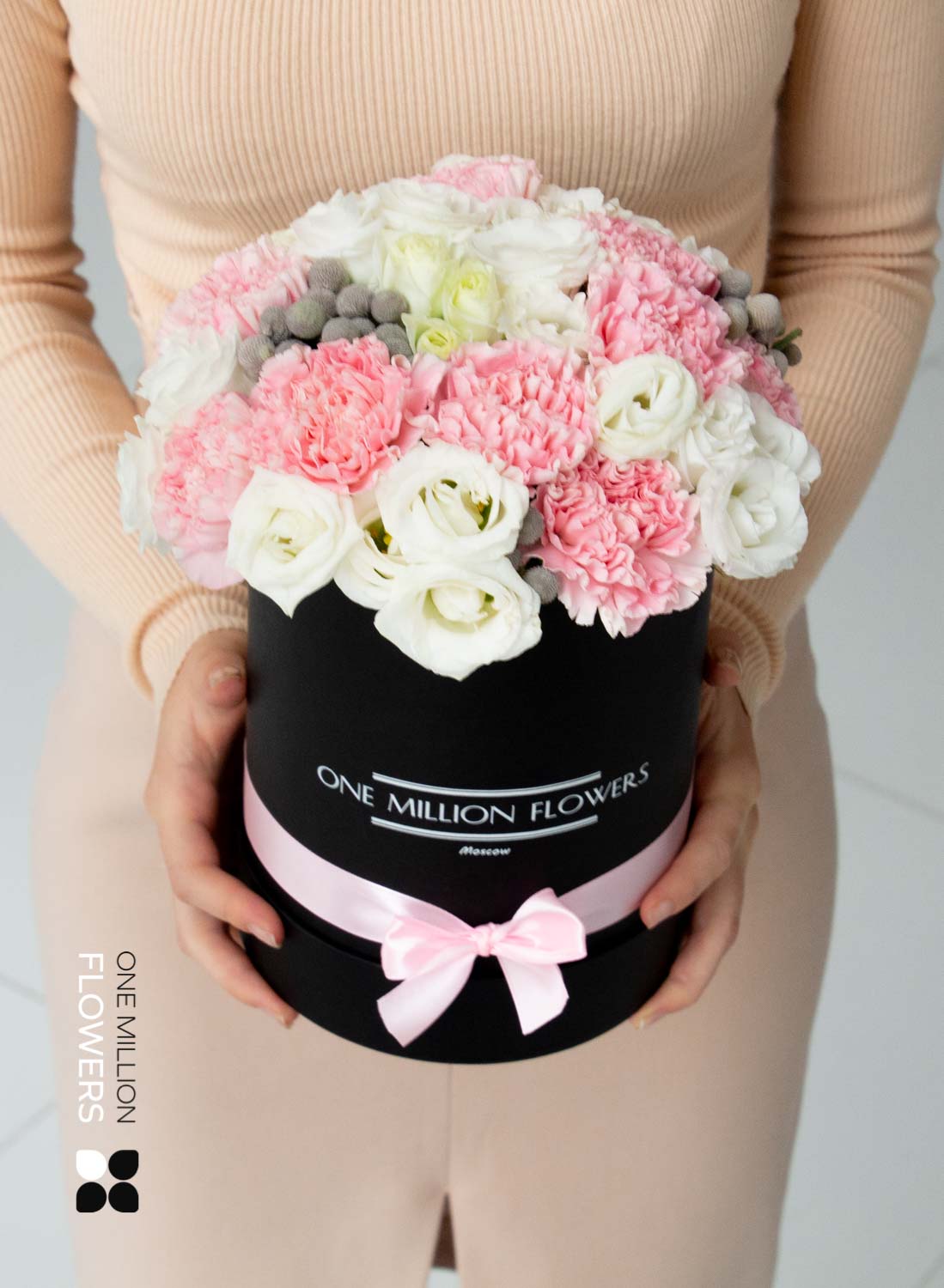 В этой коробке вас ждут прекрасные цветы: 11 нежных розовых гвоздик (диантусов), 5 изысканных эустом белого цвета, 3 милые брунии и стильная коробка Mini Black. Каждый элемент выбран с любовью и вниманием, чтобы создать гармоничную композицию, которая обязательно вызовет улыбку у получателя.