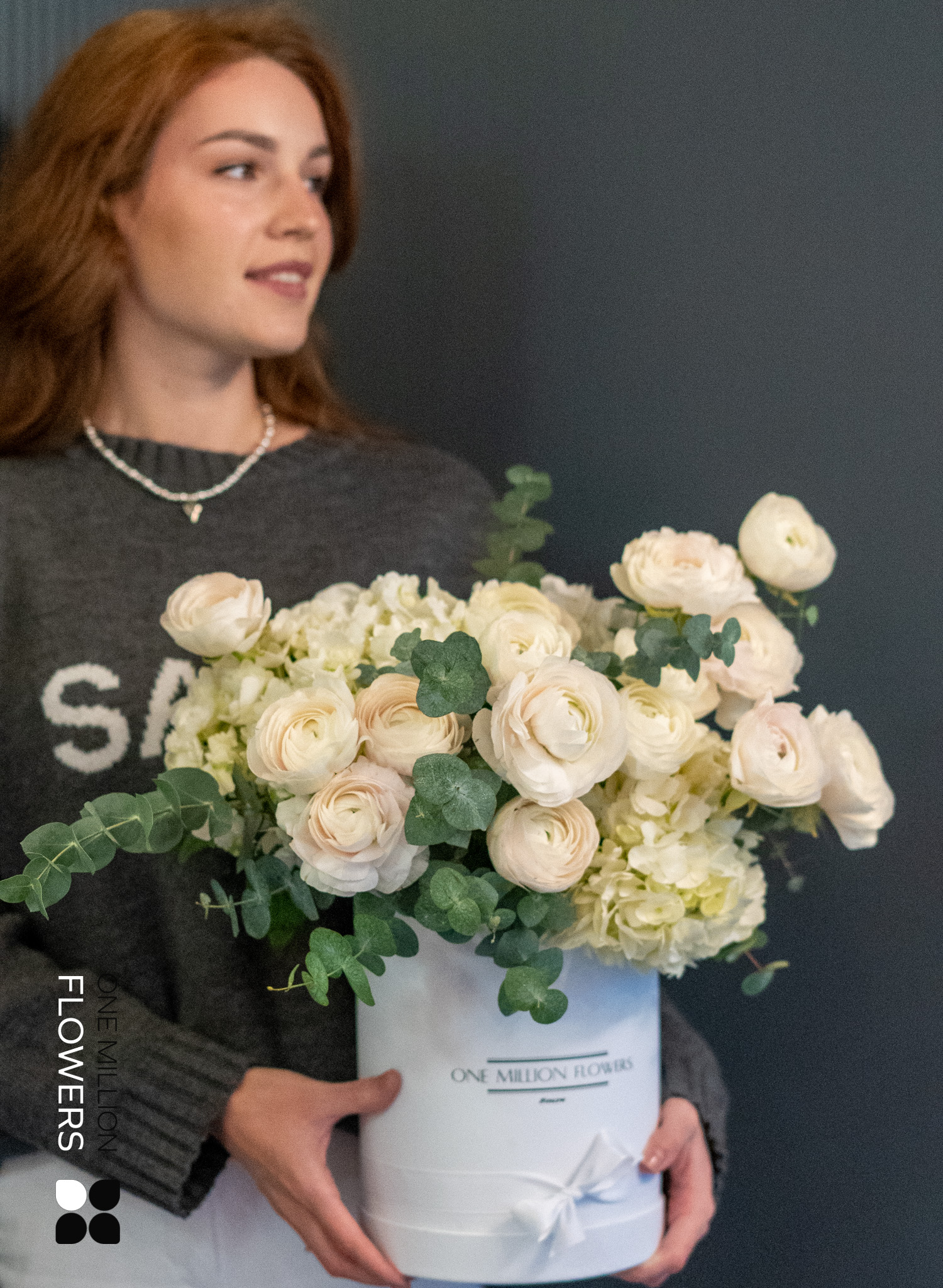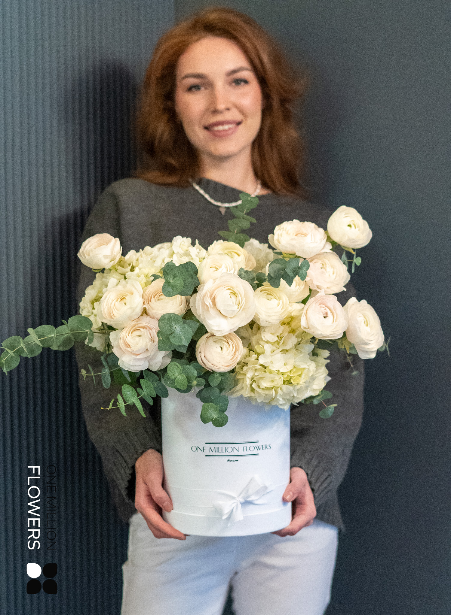 Каждая коробка содержит: 25 кремовых ранункулюсов, великолепные белые гортензии и свежий эвкалипт. Создавая этот букет, мы вложили душу и страсть к флористике, чтобы каждый элемент выделялся своей красотой. Ранункулюсы с их бархатистыми лепестками и гортензии с пышными снежными соцветиями создают атмосферу весеннего пробуждения, а эвкалипт добавляет нотку свежести и утонченности. Это идеальное сочетание цветов, которое позволит вам выразить свои чувства без слов.