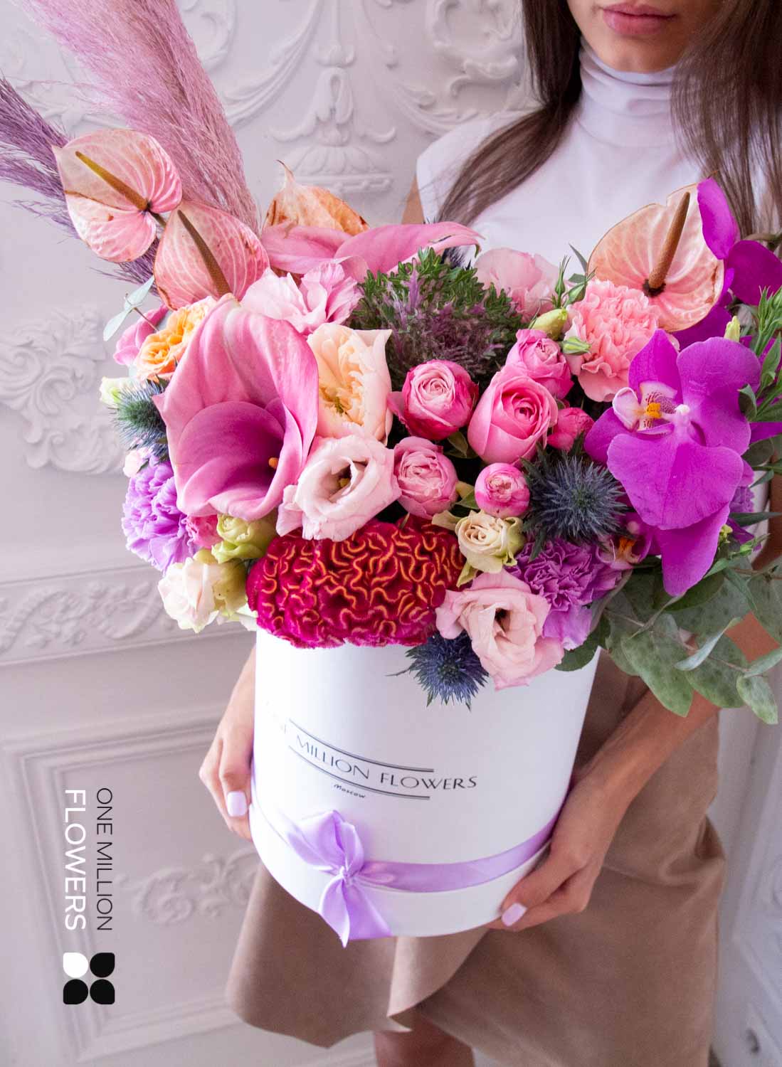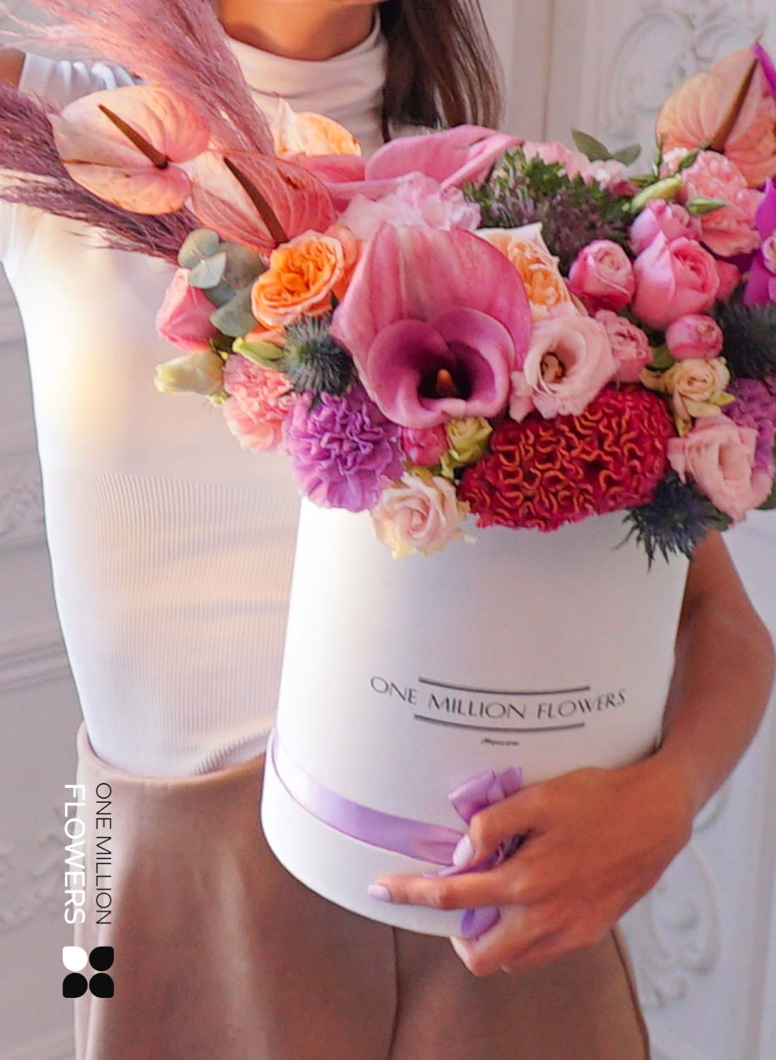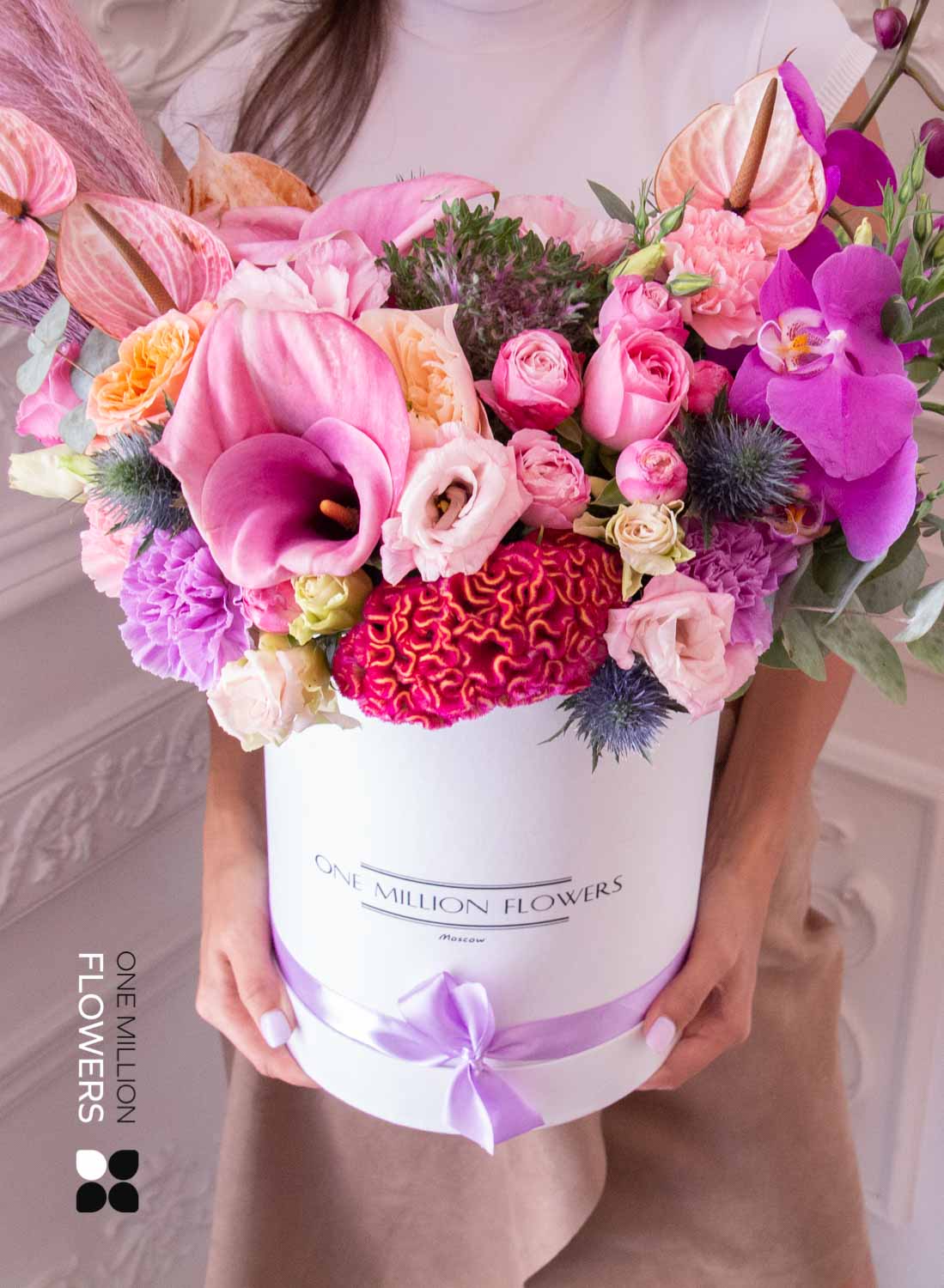 Эта цветочная коробка — выбор для тех, кто ценит стиль, лаконичность и продуманность в деталях. Белая основа задаёт чистую, современную эстетику, а композиция из свежих кустовых роз, эустомы, матиолы и эвкалипта создаёт эффект утреннего света, наполненного воздухом и надеждой. Флористы One Million Flowers собрали букет с акцентом на мягкие пастельные тона и воздушную текстуру — он буквально дышит лёгкостью.