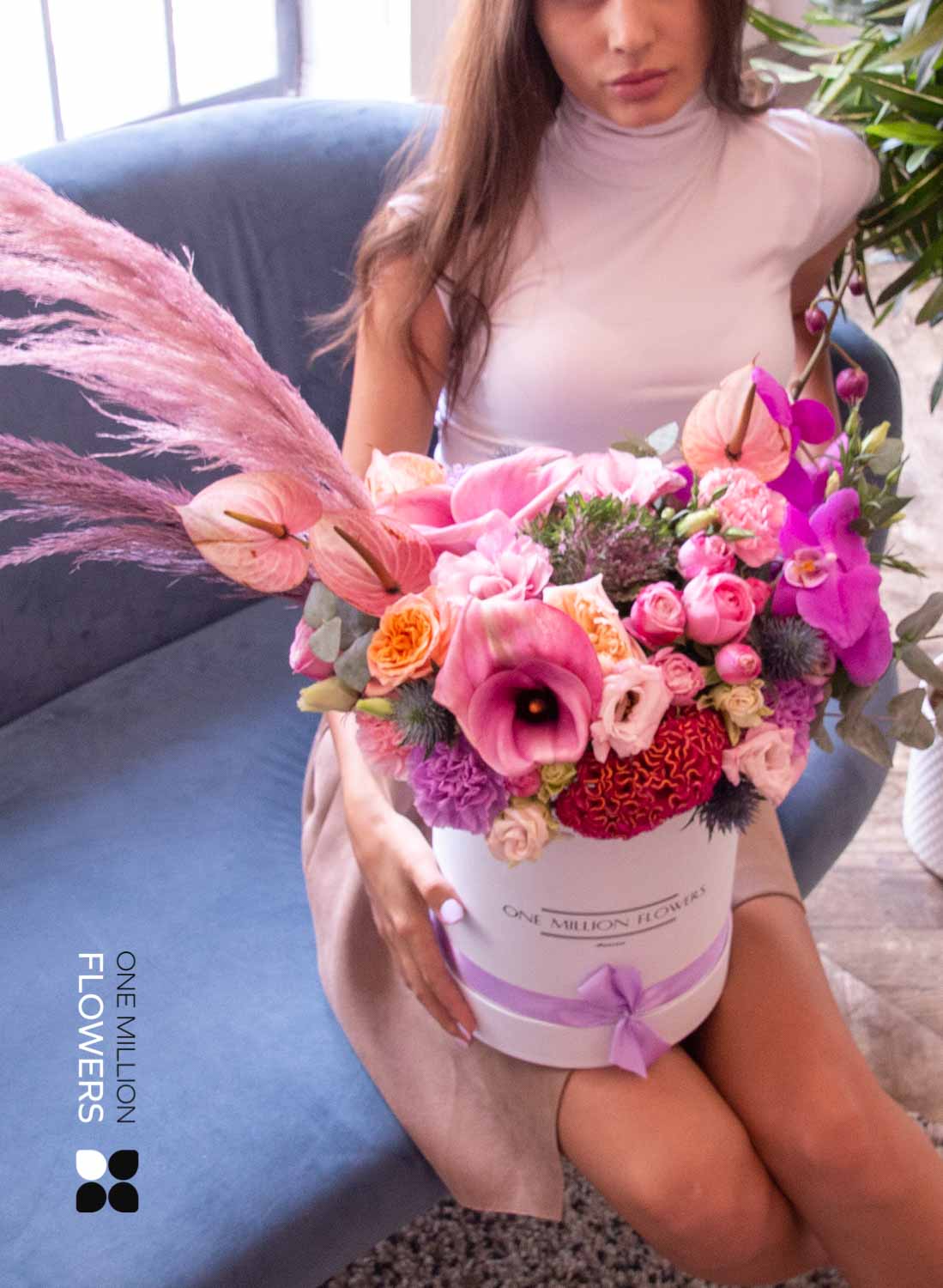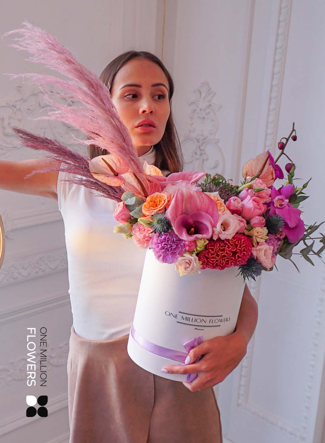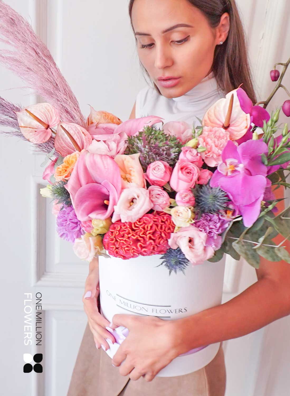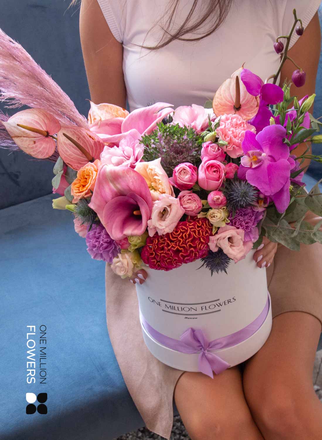 Эта цветочная коробка — выбор для тех, кто ценит стиль, лаконичность и продуманность в деталях. Белая основа задаёт чистую, современную эстетику, а композиция из свежих кустовых роз, эустомы, матиолы и эвкалипта создаёт эффект утреннего света, наполненного воздухом и надеждой. Флористы One Million Flowers собрали букет с акцентом на мягкие пастельные тона и воздушную текстуру — он буквально дышит лёгкостью.